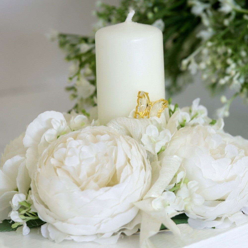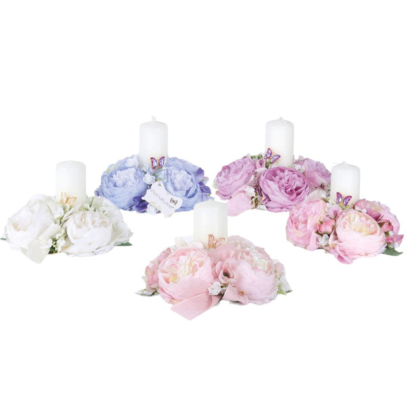 Candela della collezione Soffio di Primavera di Fiori di Lena, impreziosita con peonie e applicazione centrale.