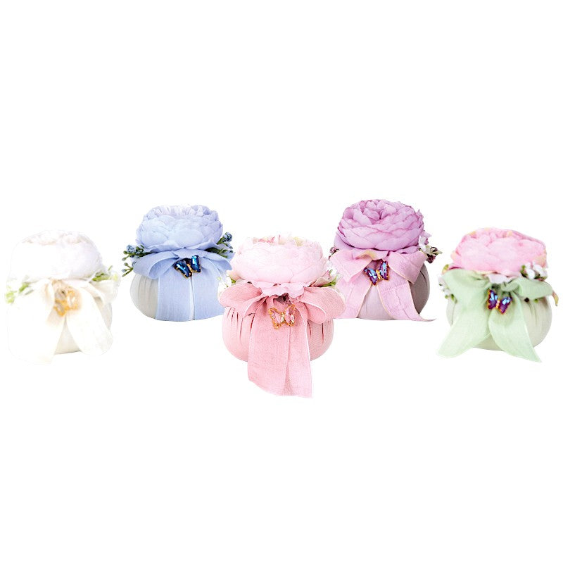 Puffo della collezione Soffio di Primavera di Fiori di Lena, realizzato in tessuto colorato con nastro, applicazione e peonia.