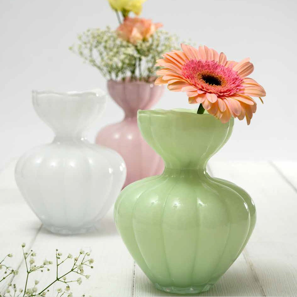 Vaso della collezione Soffi di Colore di AD, realizzata in vetro colorato completo di fiori e shopper.