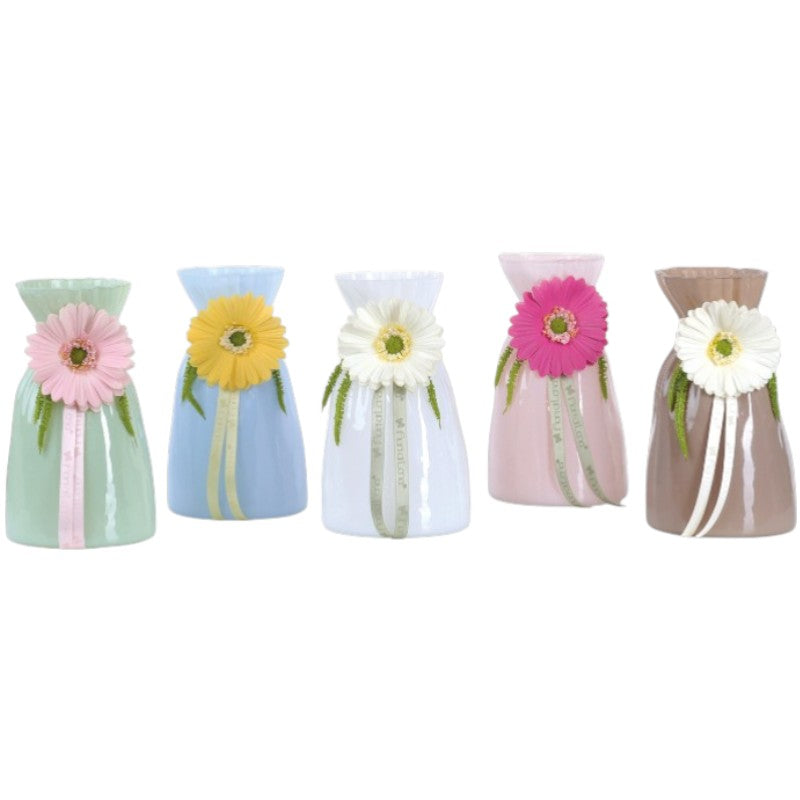Vaso della collezione Gioie di Campo di Fiori di Lena, realizzato in vetro colorato con margherita centrale.