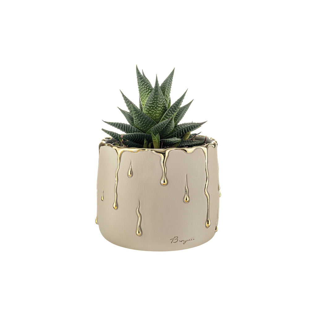 Vaso della collezione Rugiada di Bongelli Preziosi, realizzata in marmorino con piantina grassa all'interno.