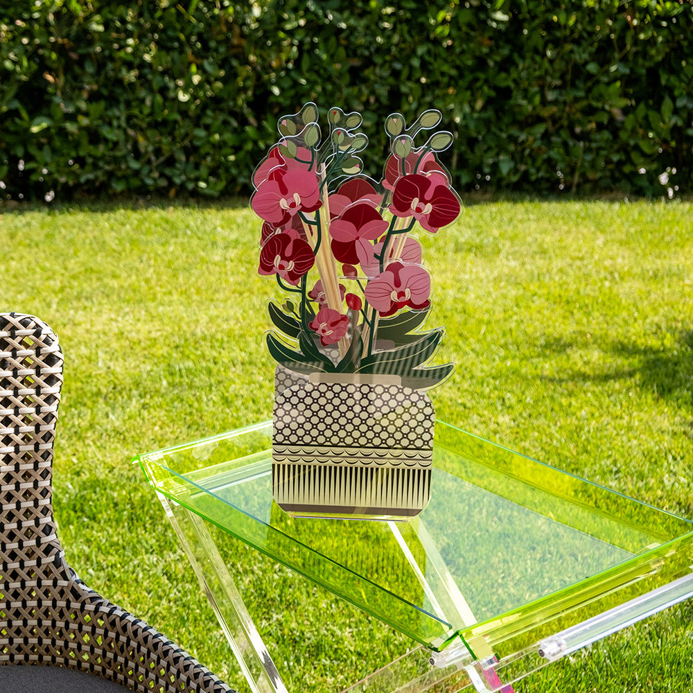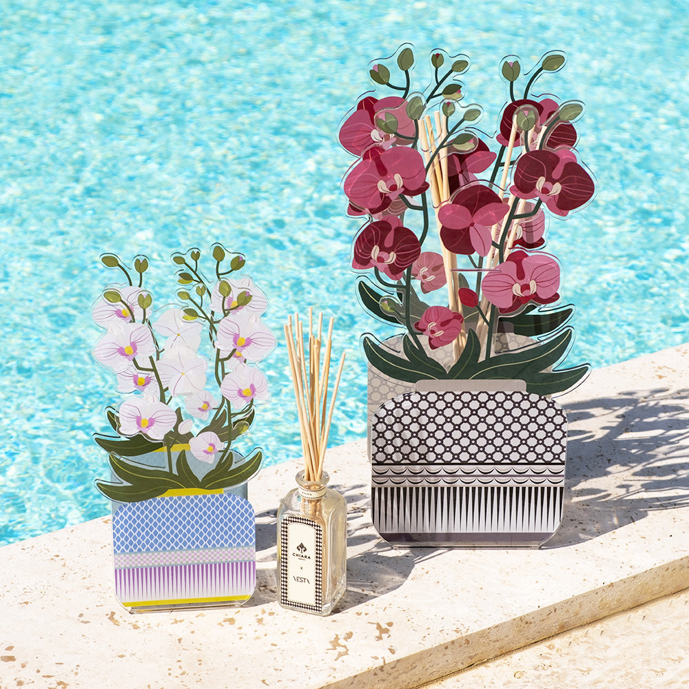Profumatore Livinia Orchidea della collezione Decor & Lifestyle di Vesta, realizzato in cristallo acrilico dal design elegante con diffusore interno, caratterizzato dalla fragranza esclusiva Destino creata in collaborazione con Chiara Firenze, con note di testa di rosa canina, prosegue con un cuore di legno di cedro e cardamomo e si completa con note di fondo di resina.