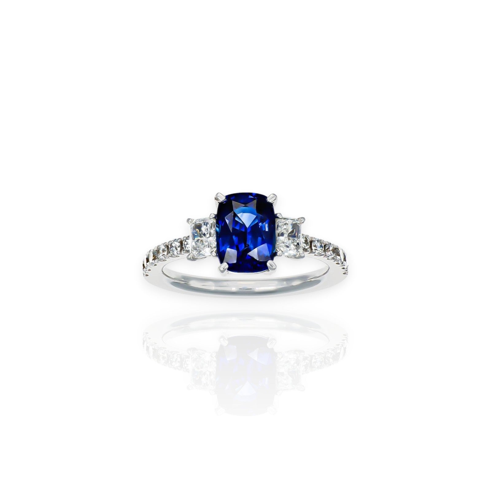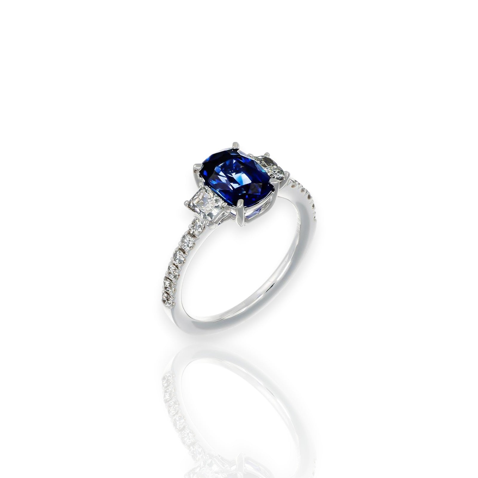 Anello trilogy della collezione Crivelli, realizzato in Oro 18kt. con diamanti taglio brillante e zaffiro centrale.