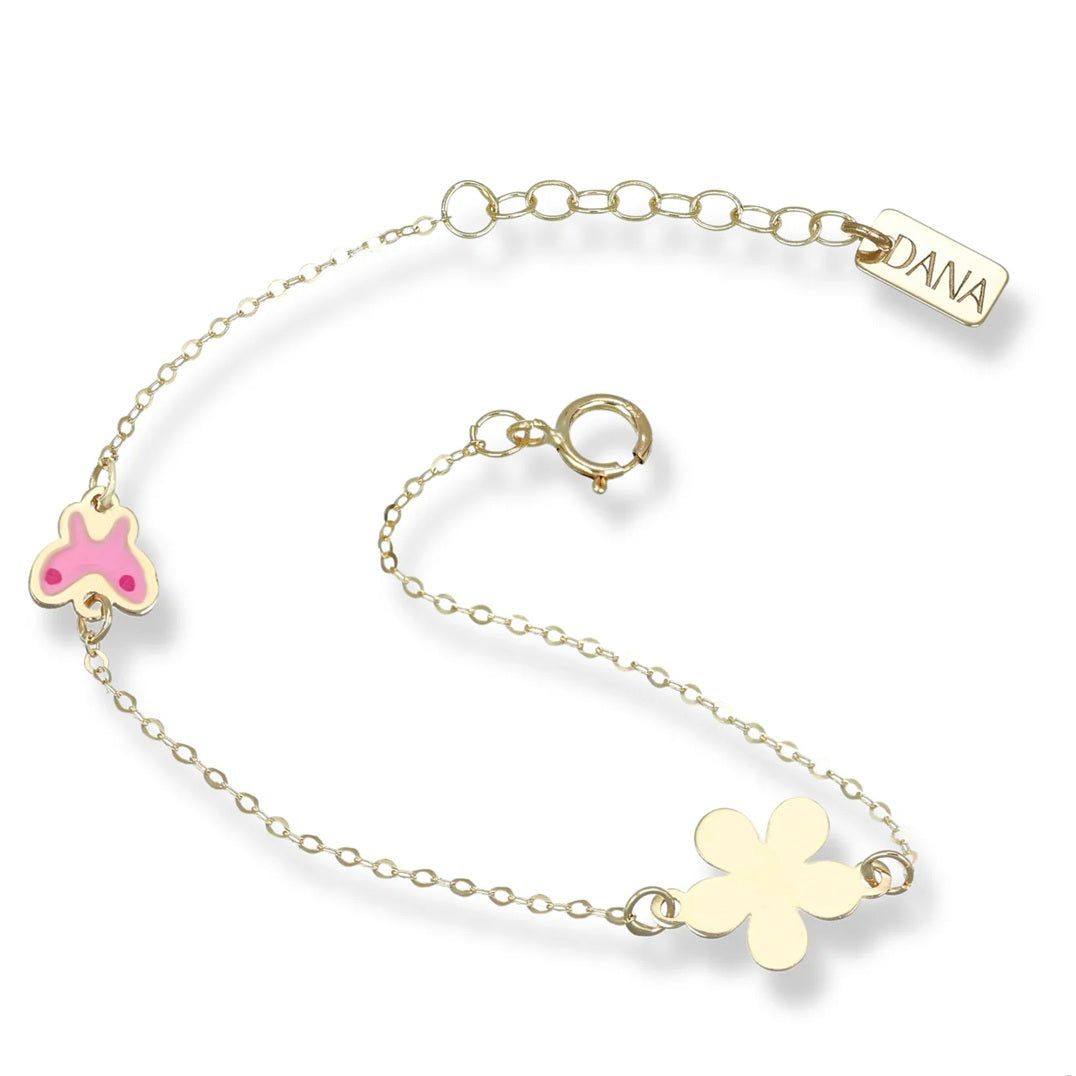 Bracciale della collezione di Dana L’Or 9 Carati, realizzato in Oro Giallo 9 kt., con fiore lucido e farfalla smaltata.