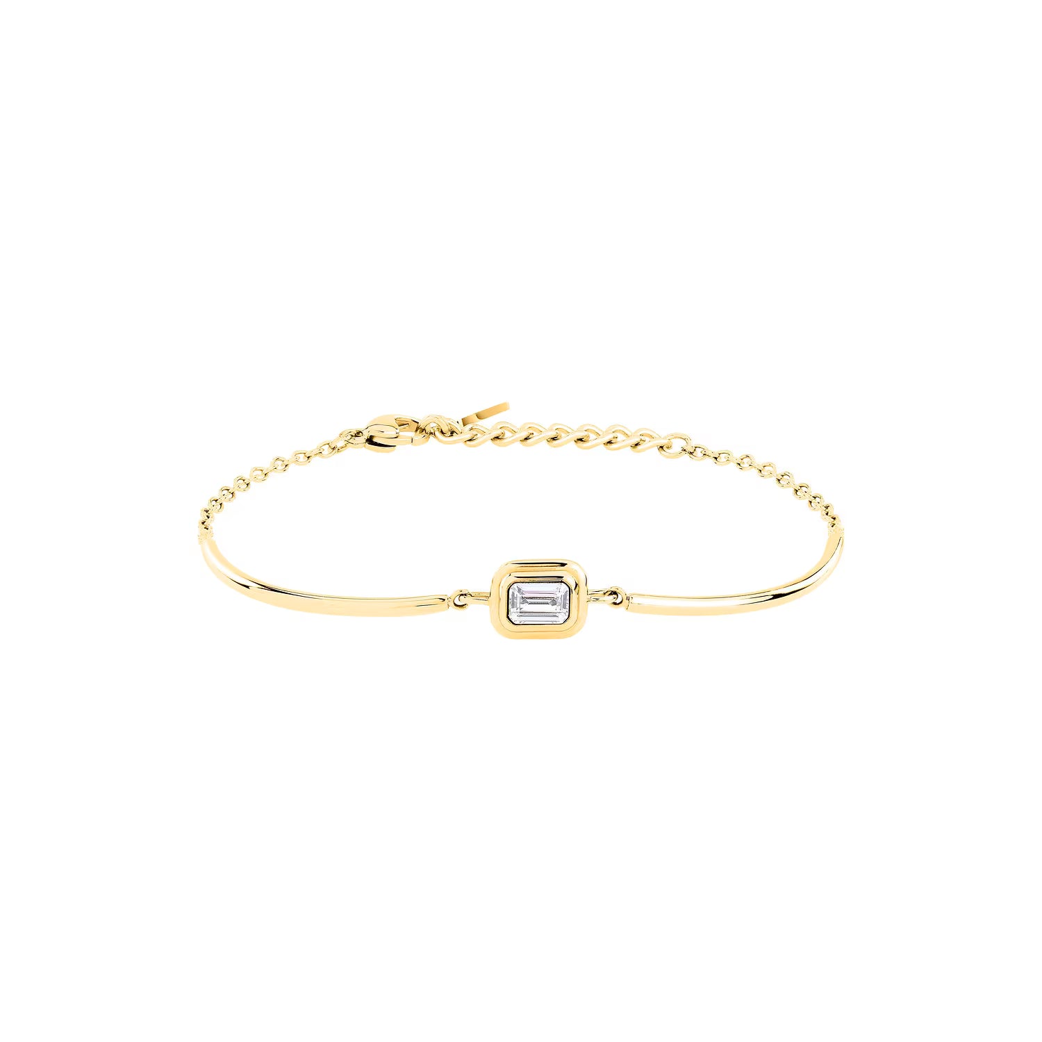 Bracciale della collezione "T-Design" di Trussardi, realizzato in acciaio anallergico con finitura gold, impreziosito da zirconi bianchi.