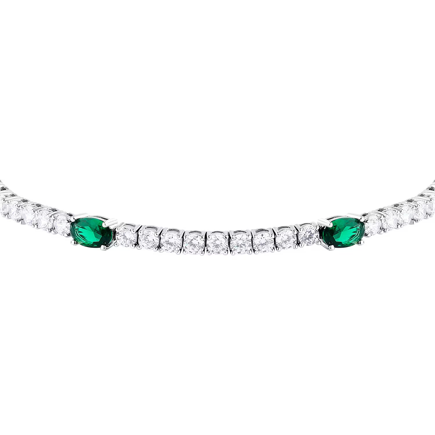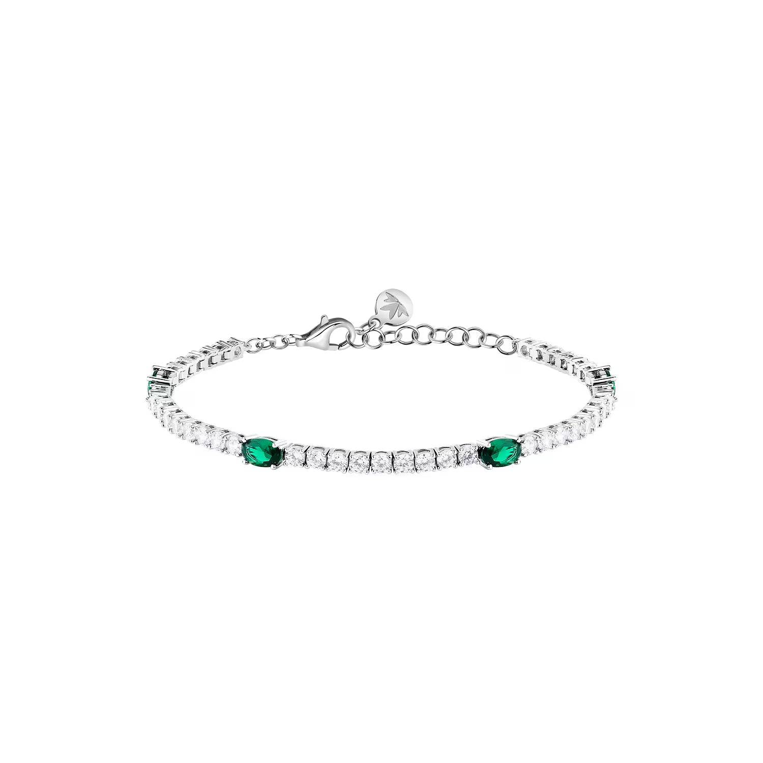 Bracciale Tennis della collezione “Tesori” di Morellato, realizzato in Argento 925%, impreziosito da cristalli bianchi e verdi.
