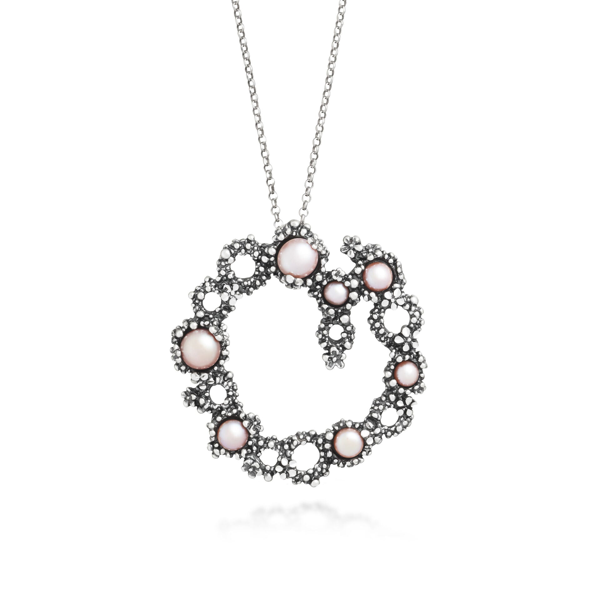 Collana pendente della collezione "Blossom" di Giovanni Raspini, realizzata in argento 925%, impreziosita da perle rosa naturali.