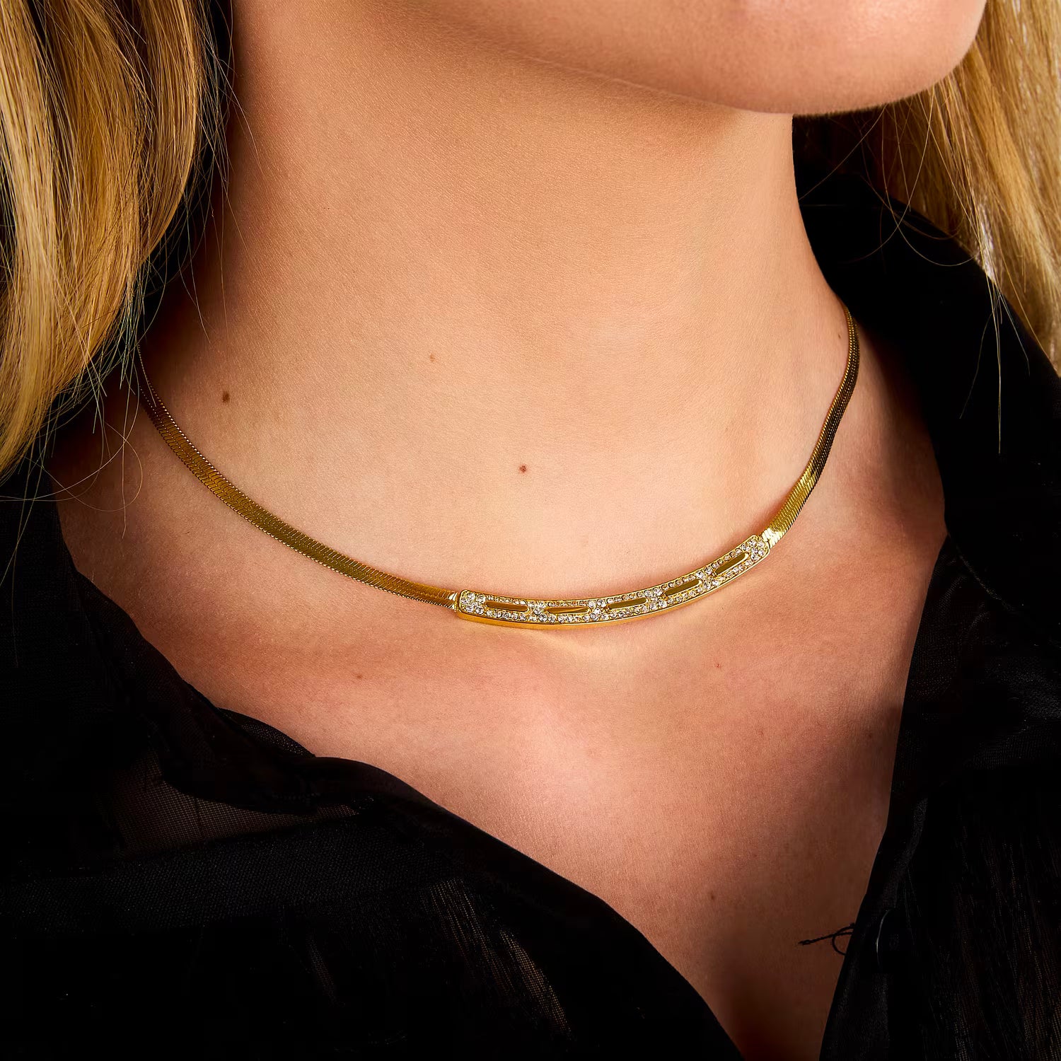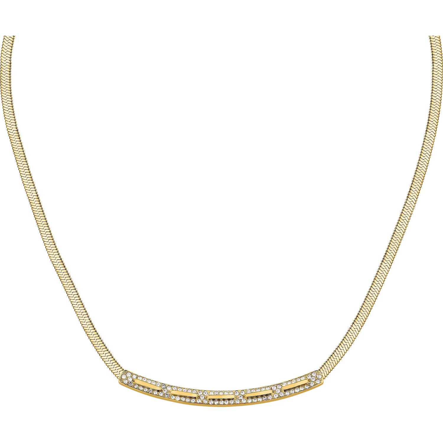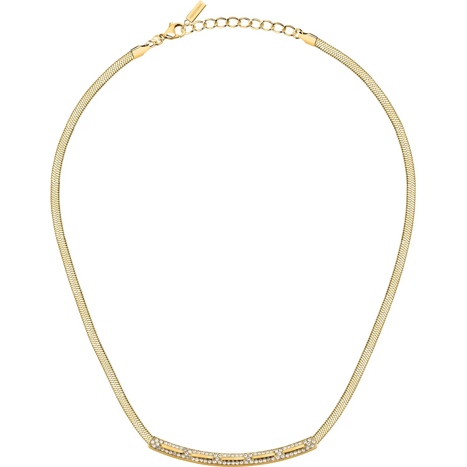 Collana donna della collezione Concept di Trussardi, realizzata in acciaio anallergico con finitura gold impreziosito da targa centrale con zirconi.