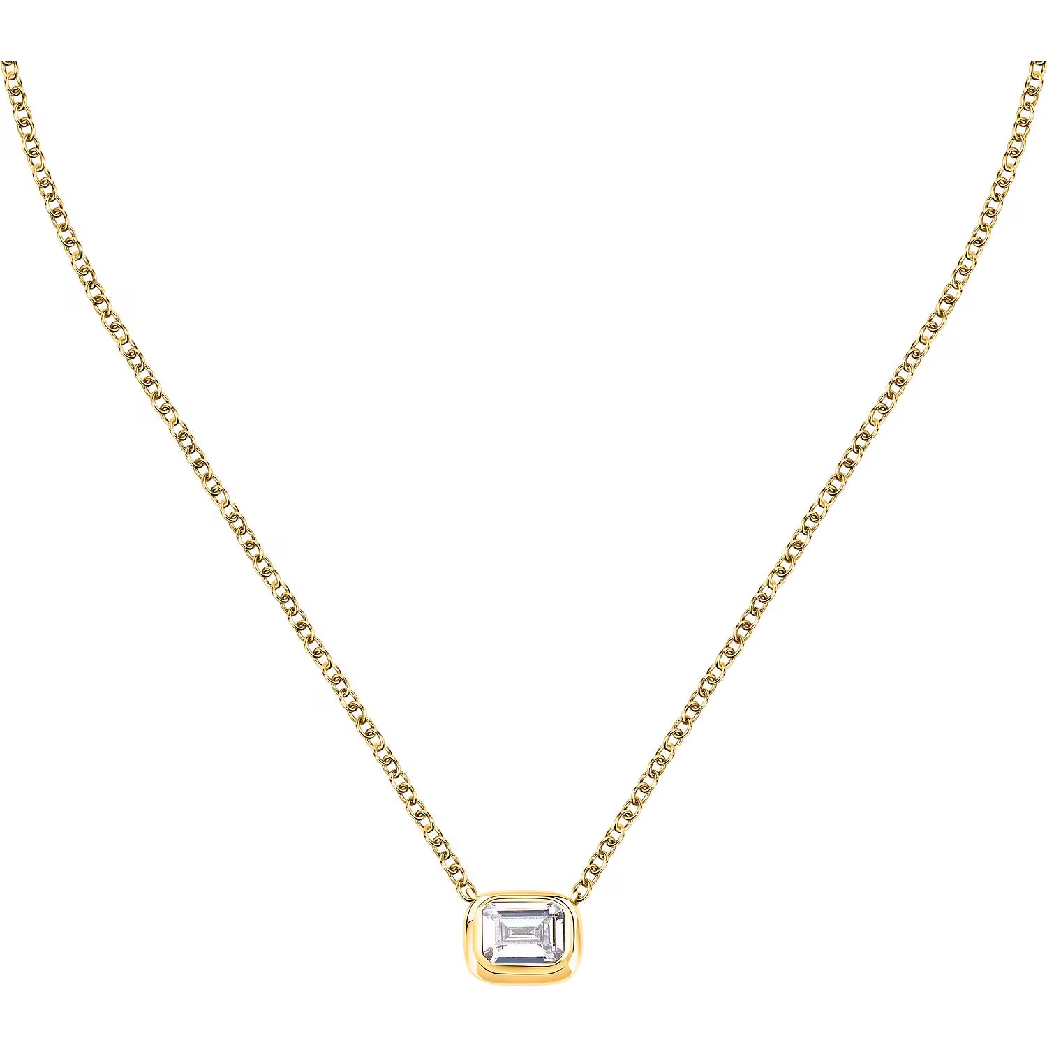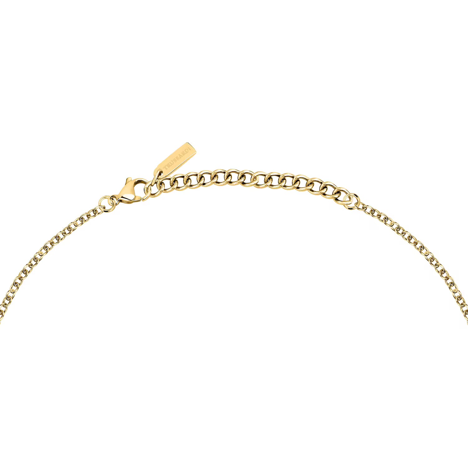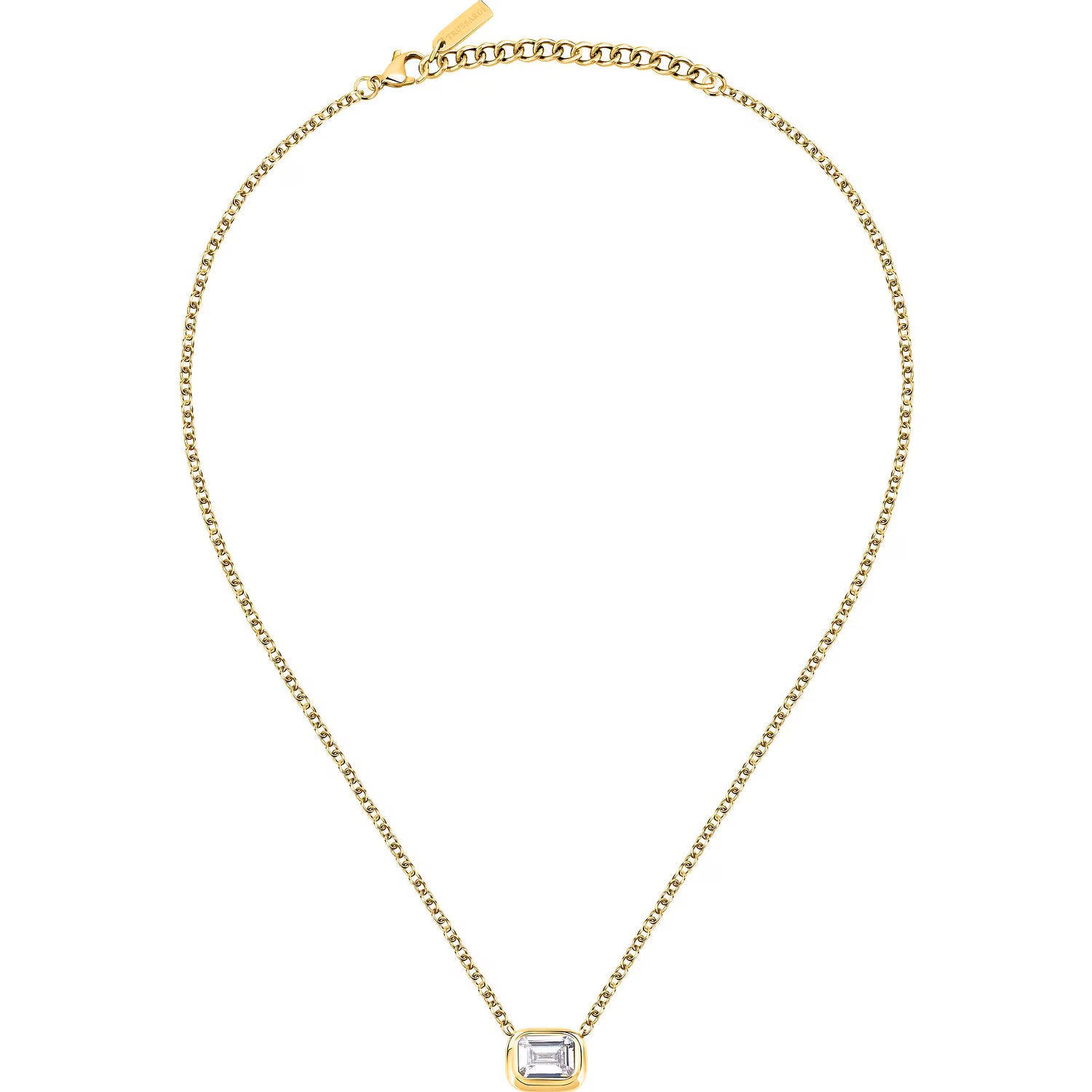 Collana donna della collezione T-design di Trussardi, realizzata in acciaio anallergico con finitura gold e pendente con zircone centrale.