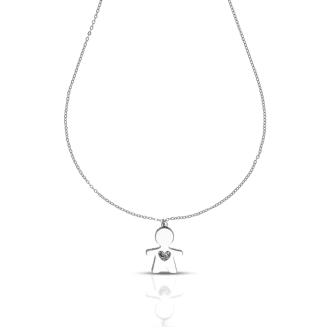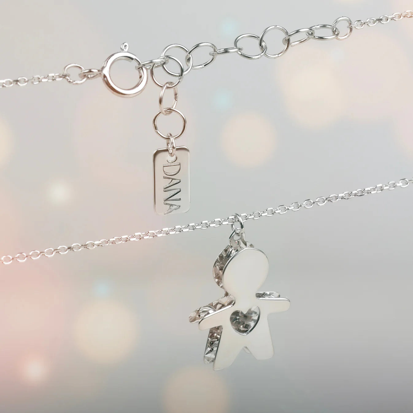 Collana della collezione Primi Battiti di Dana L’Or 9 Carati, realizzata in Oro Bianco 9 kt., con bebè maschio pendente a doppia lastra diamantato e cuore traforato