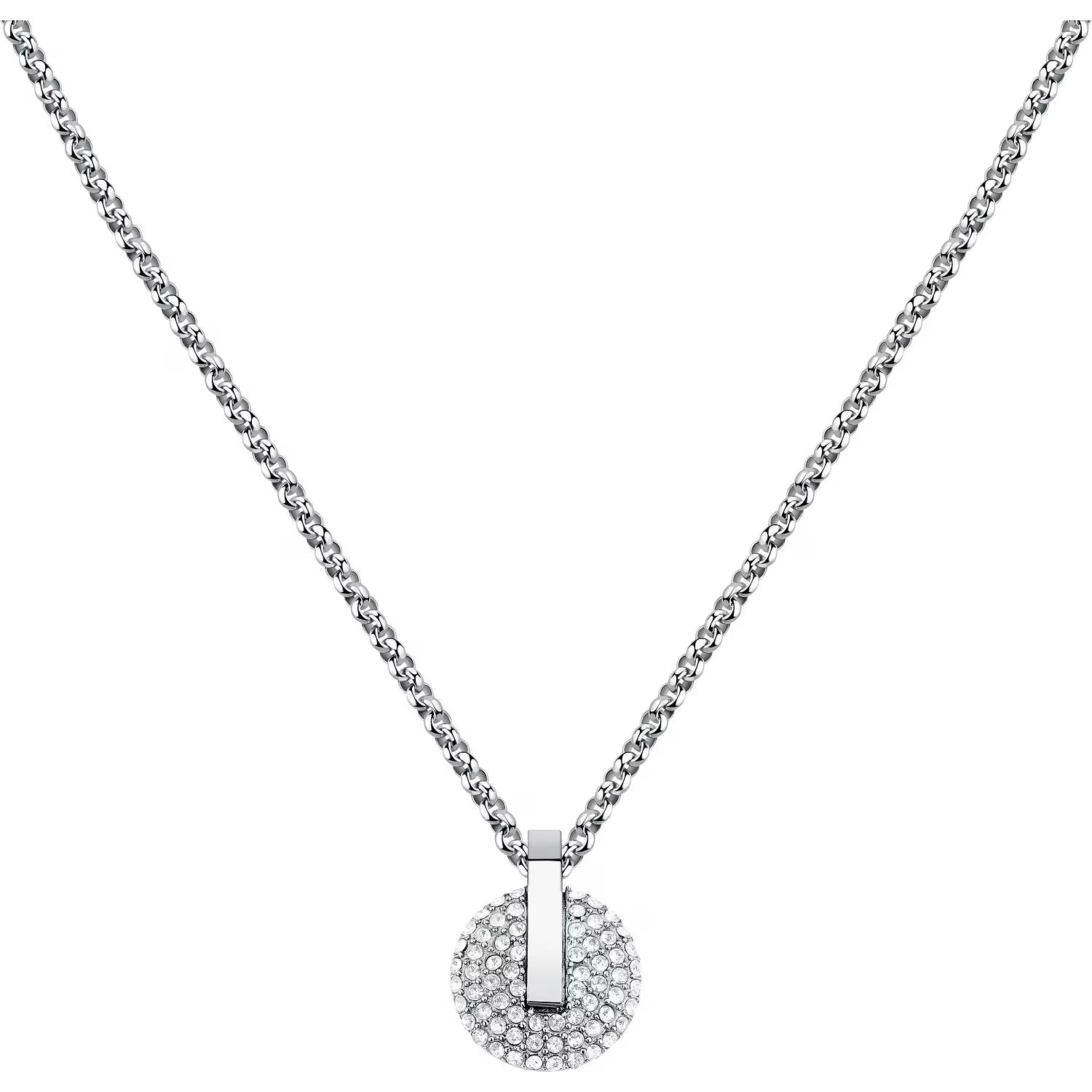 Collana della collezione T-Round di Trussardi, realizzata in acciaio anallergico con pendente, impreziosito da zirconi bianchi.