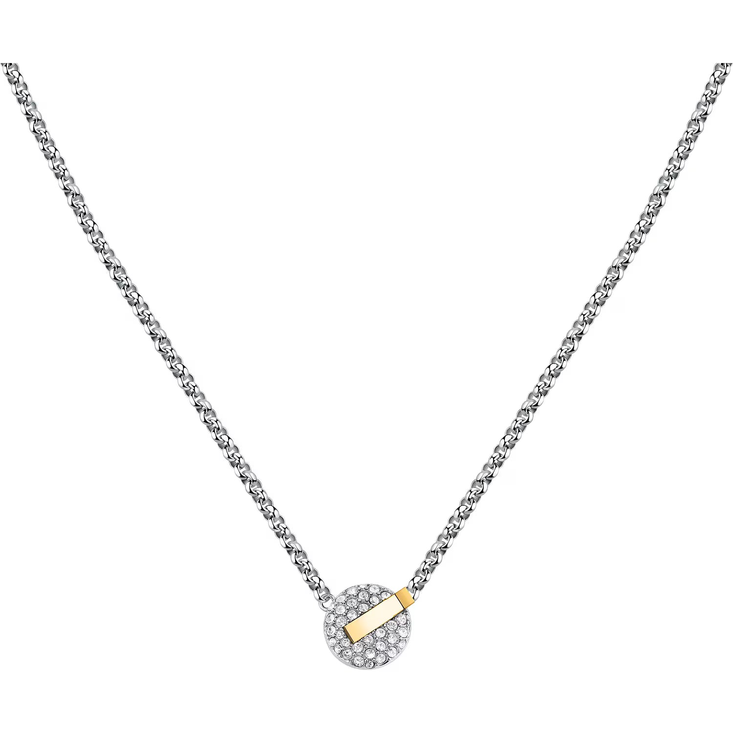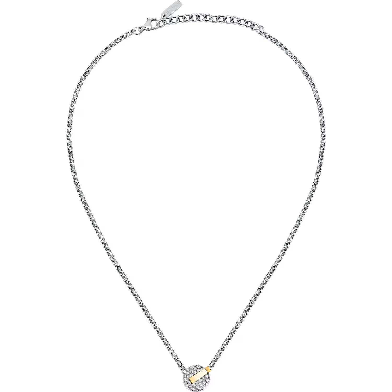 Collana della collezione T-Round di Trussardi, realizzata in acciaio anallergico con pendente, impreziosito da zirconi bianchi.
