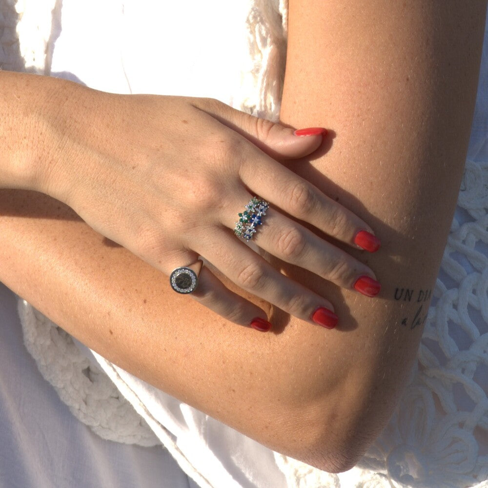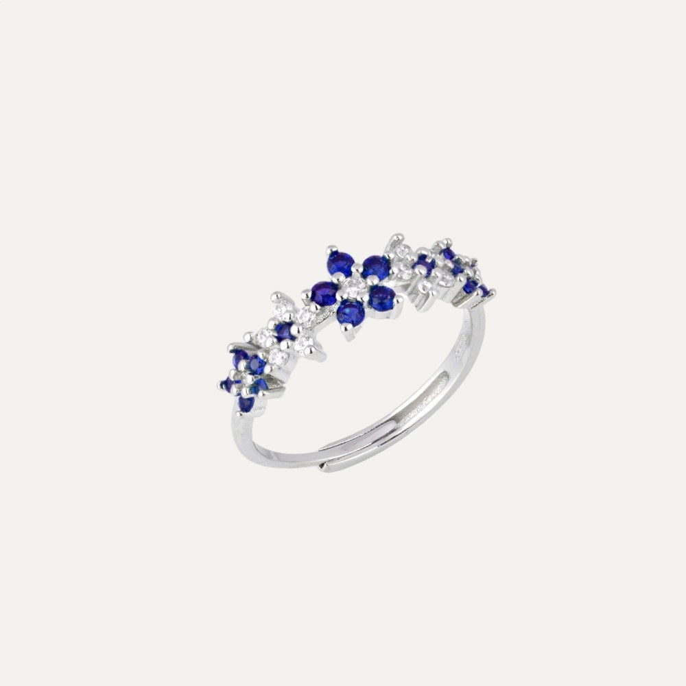 Anello Flowers realizzato in Argento 925% rodiato in Oro Bianco 18 kt. impreziosito da zirconi blu e bianchi.