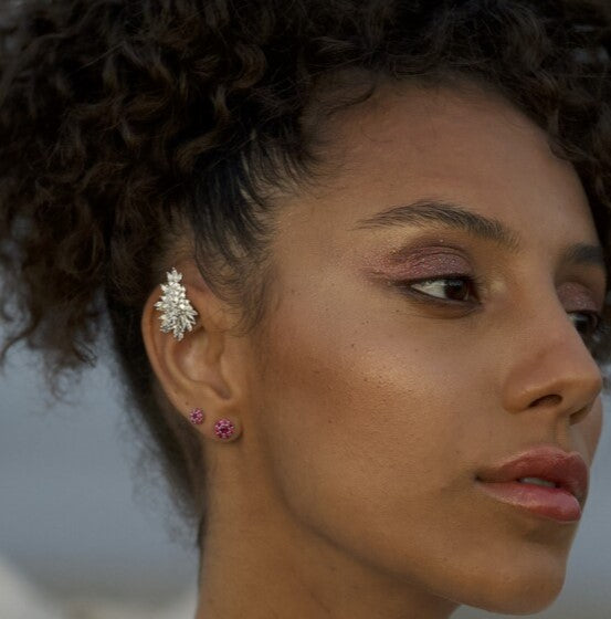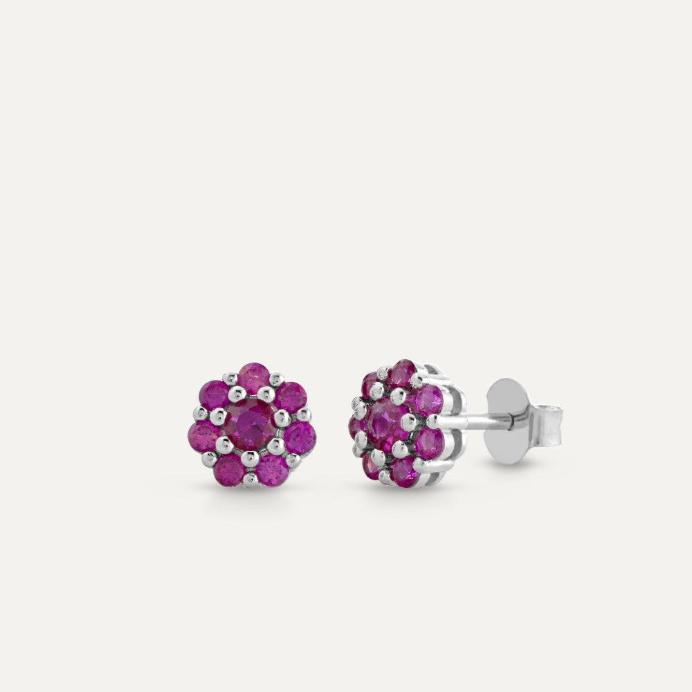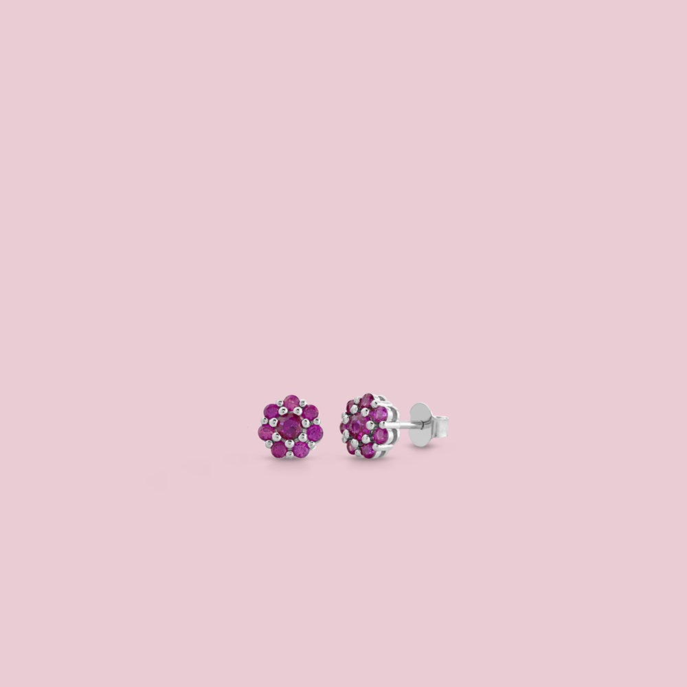 Orecchini Mini Flower realizzati in Argento 925% rodiati in Oro Bianco 18 kt., impreziositi da zirconi fucsia.