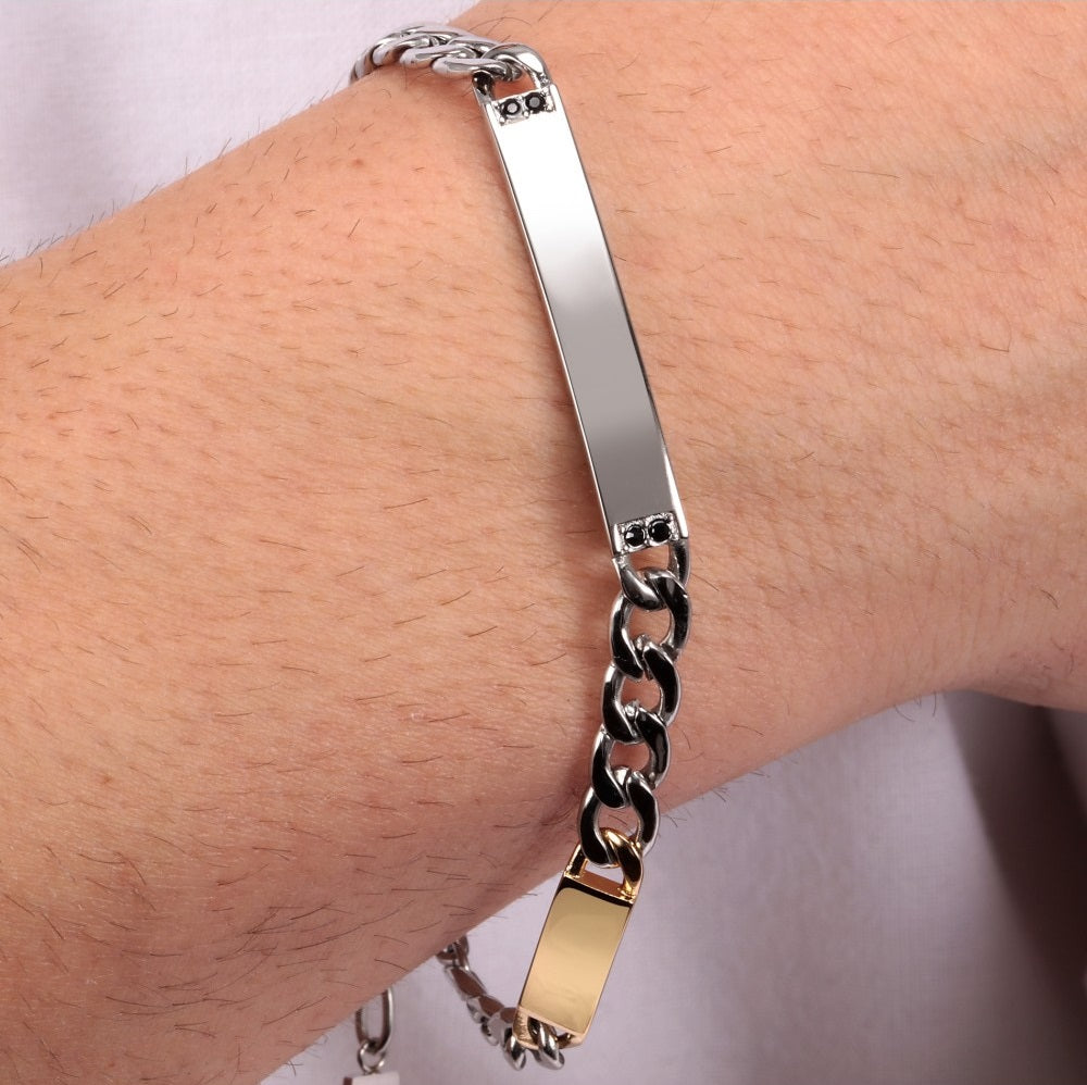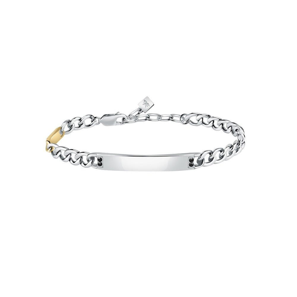 Bracciale uomo della collezione Catene di Morellato realizzato in acciaio anallergico laterale con finitura corata e targa centrale impreziosita da zirconi neri. Presenta una lunghezza di 22 cm e chiusura a moschettone.