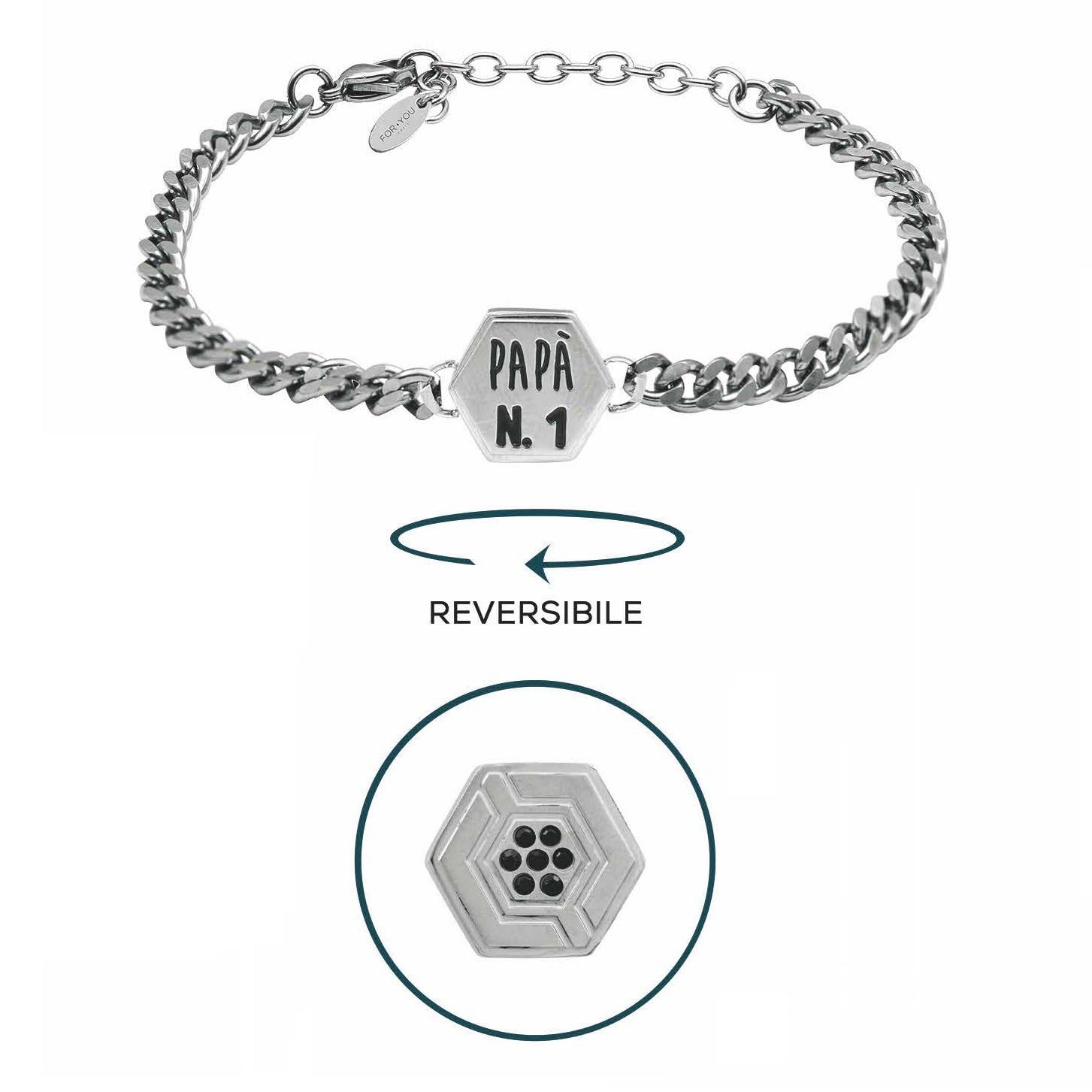 Bracciale reversibile della collezione Prestigio Gioielli, realizzato in acciaio inossidabile, con incisione smaltata "PAPA' N.1'", impreziosito da zirconi neri sul retro.