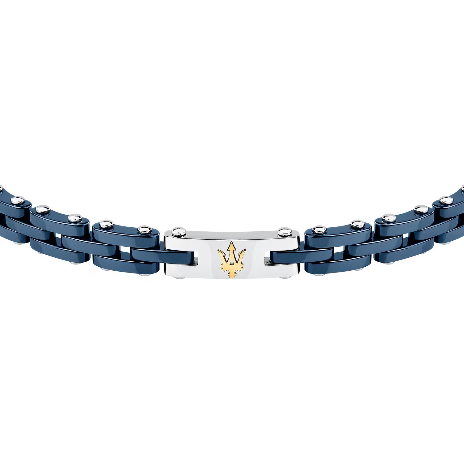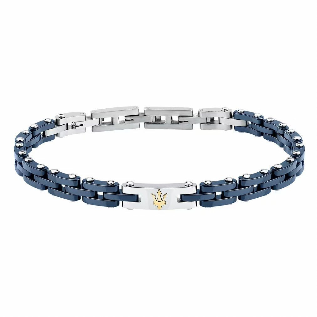 Bracciale da uomo della collezione "Ceramic" di Maserati, realizzato in acciaio anallergico e ceramica blu e logo centrale dorato.