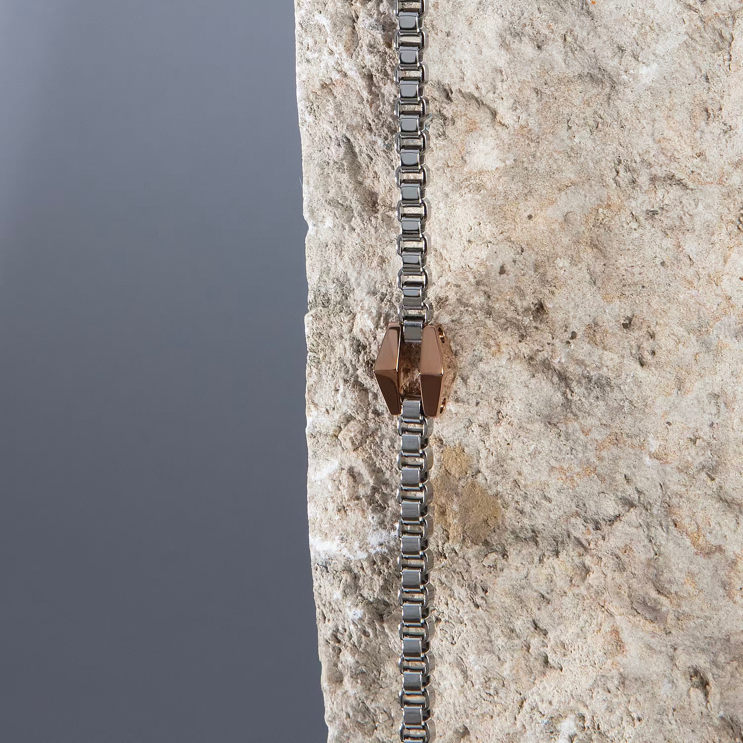 La lunghezza relativa al bracciale è di 18+3 cm. con chiusura a moschettone.