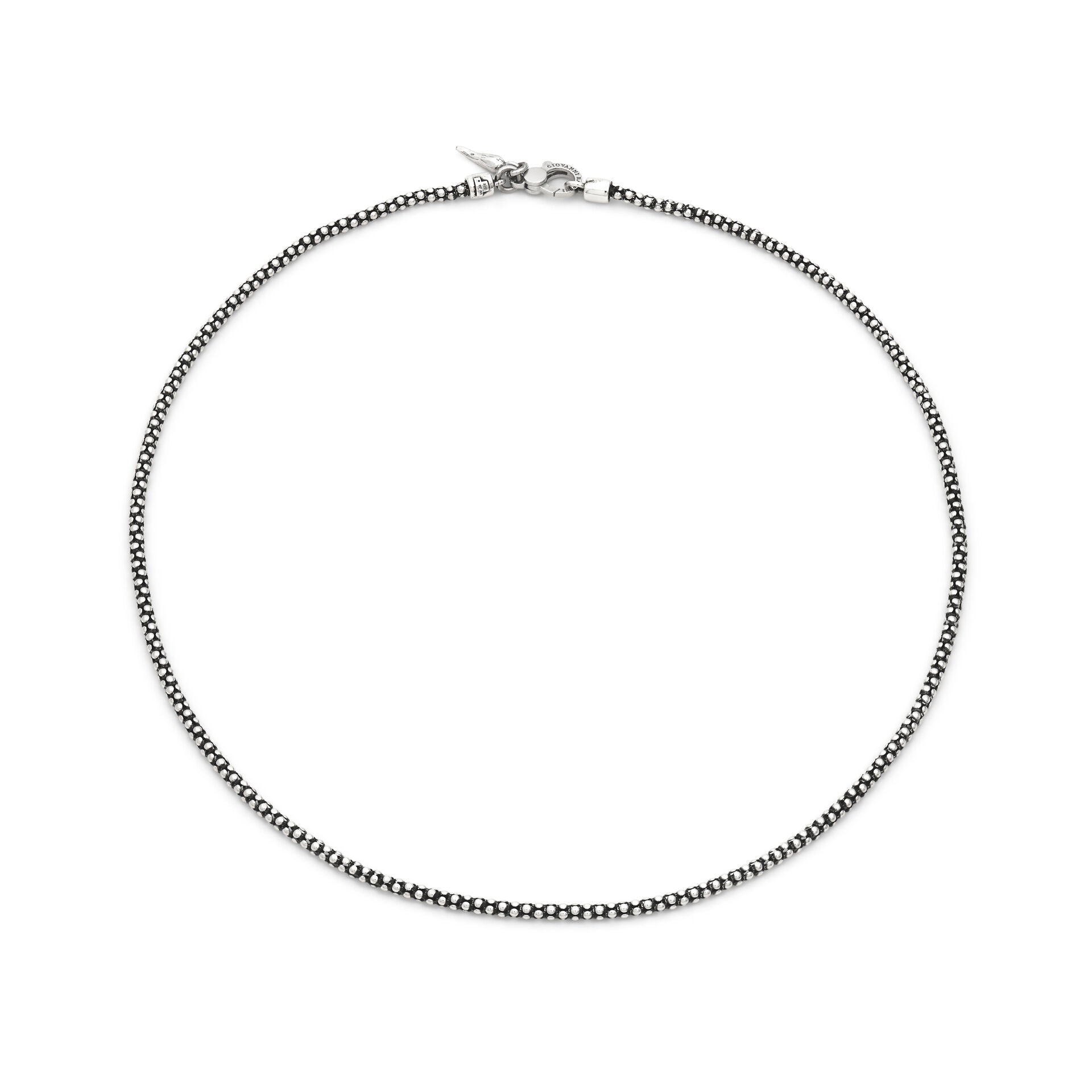 Vivace e luminosa, questa collana in argento si distingue per la sua micro-struttura “a popcorn”, capace di creare un audace gioco di luce che dona al gioiello un’eleganza contemporanea e decisa.