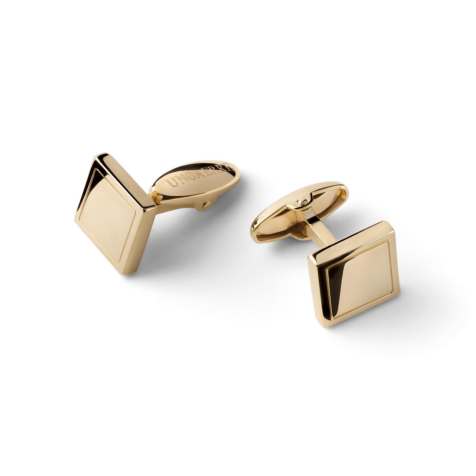 Gemelli da uomo guilloché quadrati della collezione Unoaerre, realizzati in argento 925 % con finitura gold.