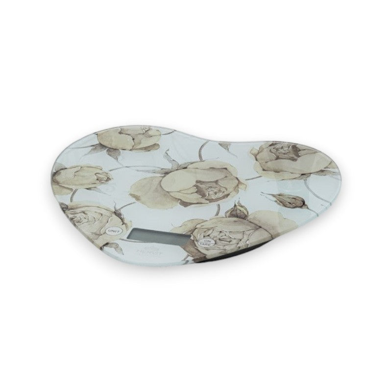 Bilancia Digitale da Cucina a forma di cuore appartenente alla collezione "Cottage" di Hervit, realizzata in vetro glass, con stampa digitale e alimentazione a batterie (non incluse).