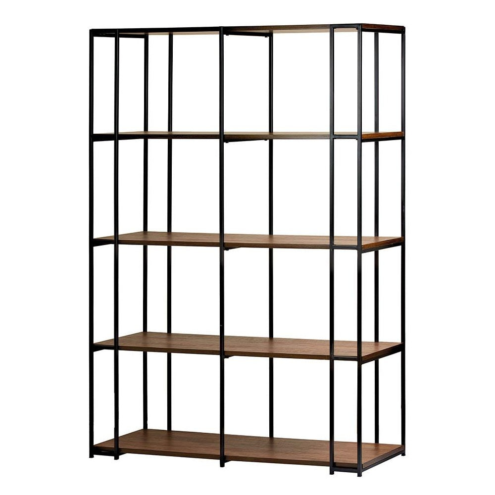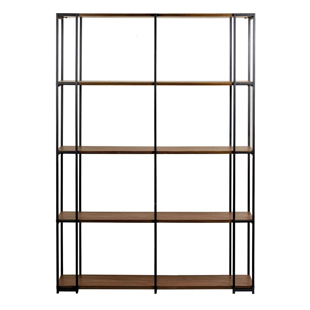 Libreria/Espositore della collezione Contemporaneo di L'Oca Nera, caratterizzata da 4 ripiani, con struttura in metallo nero e piani in MDF nobilitato di color legno scuro.