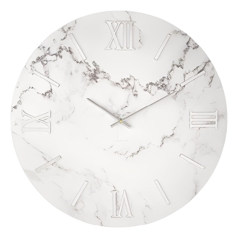 Orologio da parete della collezione di L'Arte di Nacchi, realizzato in legno MDF resistente, su cui è applicata una stampa effetto marmo lucido, con lancette in ferro e numeri in plexiglas.