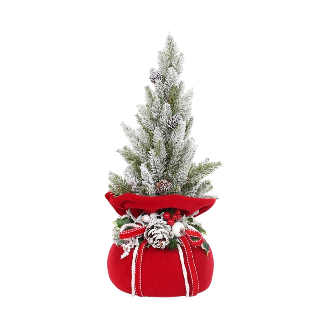 Albero di Natale della collezione Abbraccio di Natale di Fiori di Lena, realizzato da una base in velluto rosso con nastro e decorazioni centrali.
