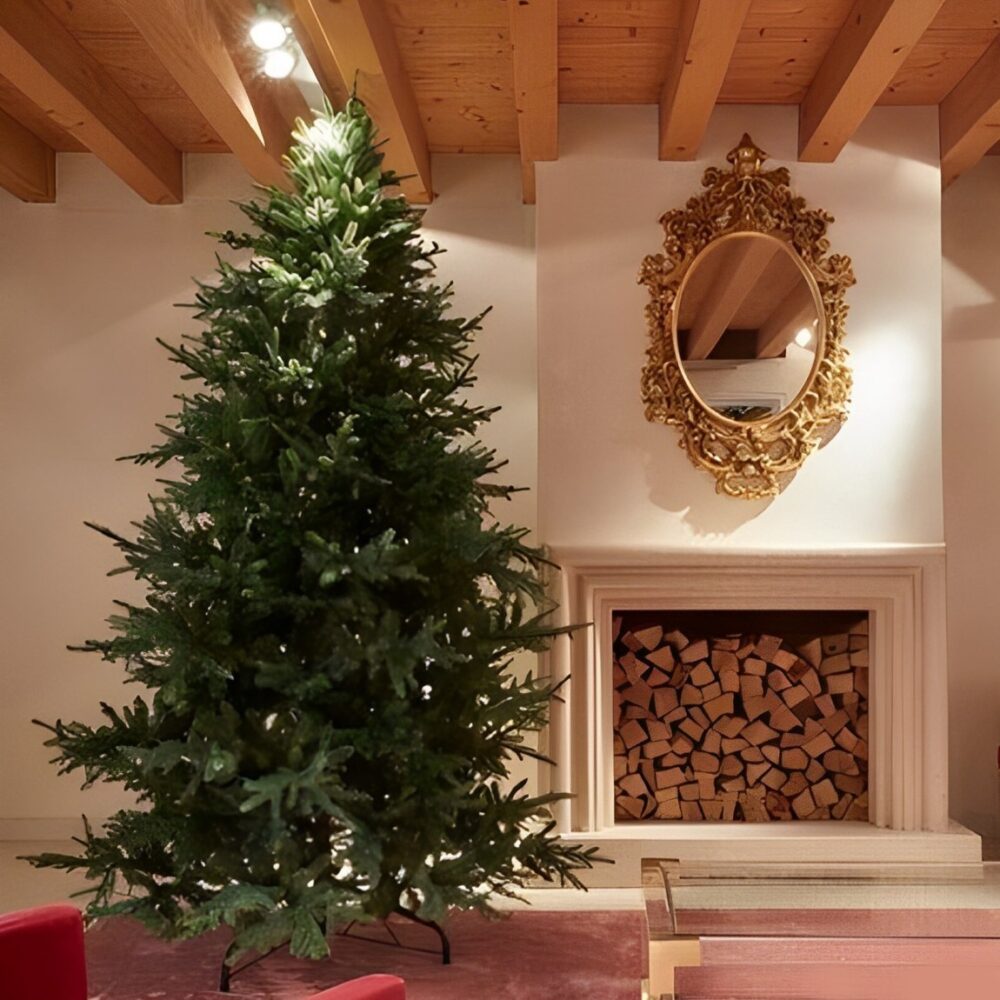 Albero di Natale Pino Luxury della collezione di Enzo De Gasperi, caratterizzato da 6140 rami (4018PE+2122PVC) e con base in metallo.