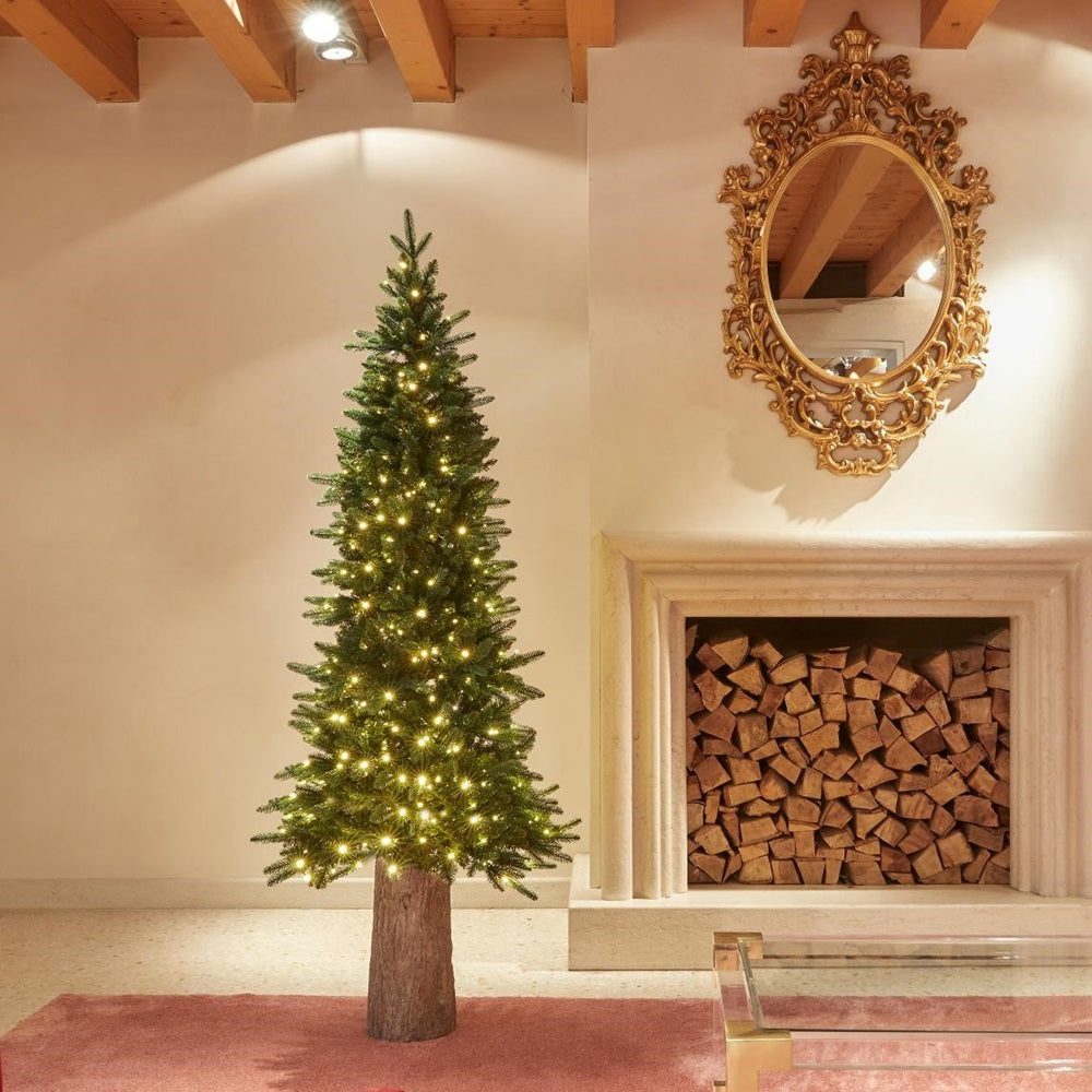 Albero Pino Slim della collezione di Enzo De Gasperi, caratterizzato da 1094 rami (636PE+458PVC), con 360 luci MINILED integrate e base in metallo.