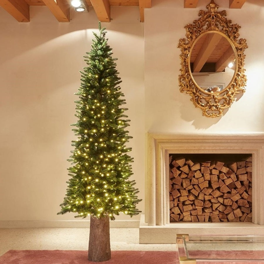 Albero Pino Slim della collezione di Enzo De Gasperi, caratterizzato da 1418 rami (798PE+620PVC), con 480 luci MINILED integrate e base in metallo.