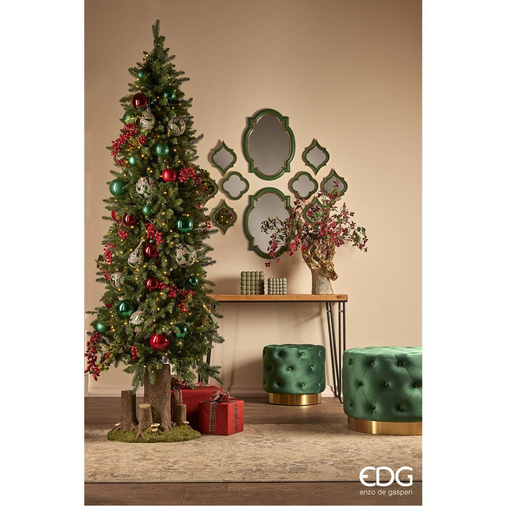 Albero Pino Slim della collezione di Enzo De Gasperi, caratterizzato da: 1790 rami (960PE+830PVC), con 610 luci MINILED integrate e base in metallo.