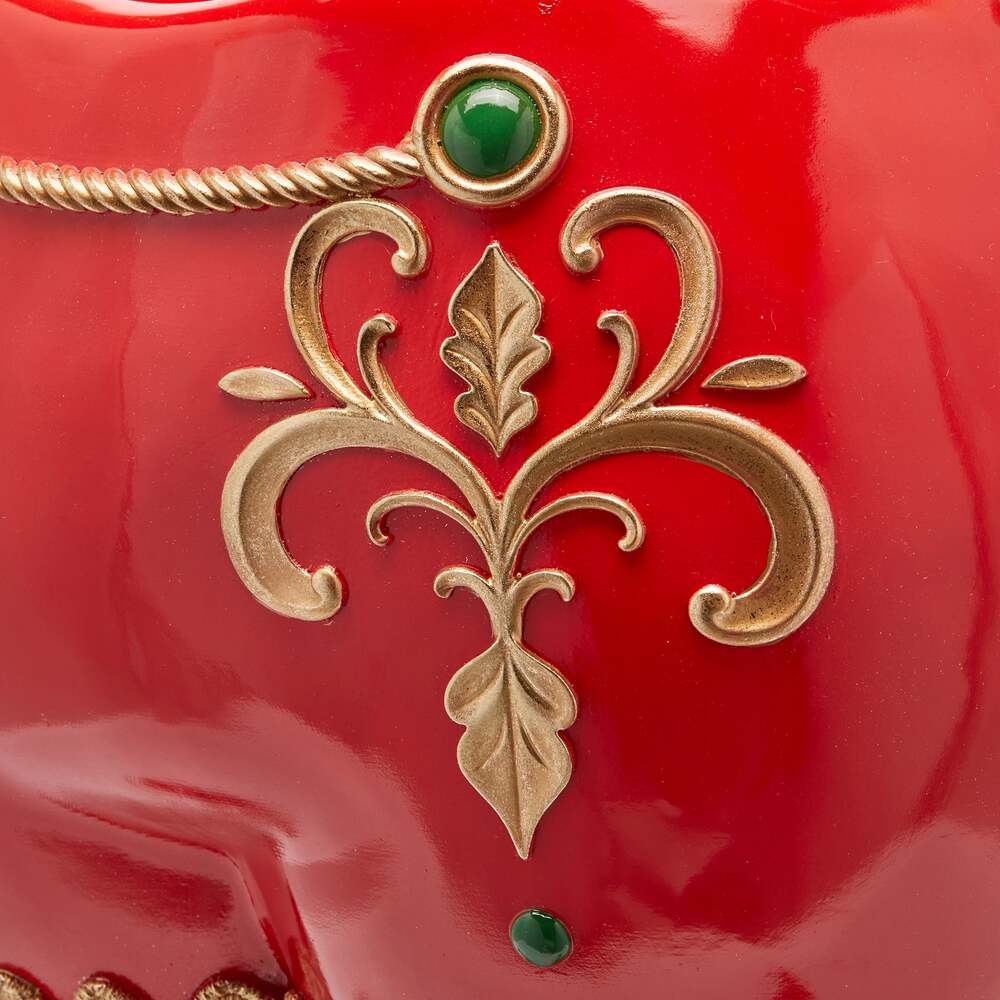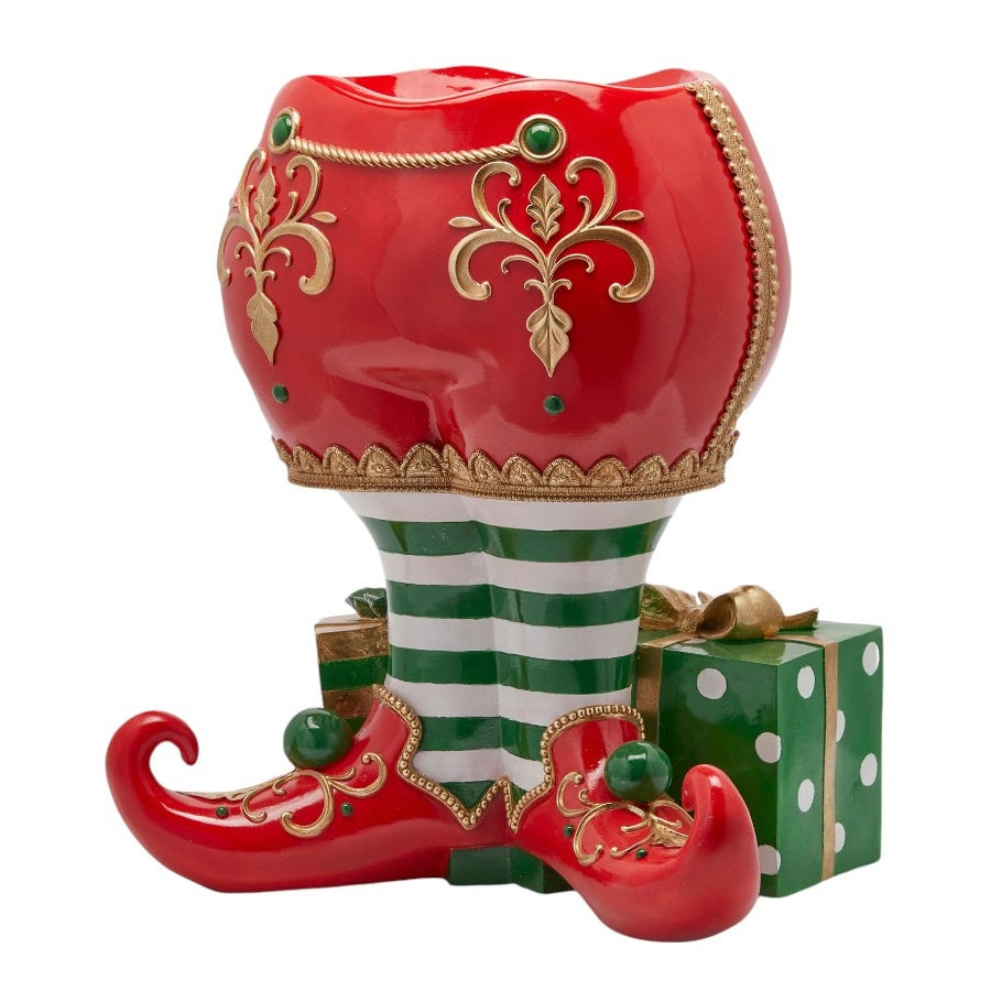 Base per pino raffigurante il busto inferiore di un elfo con i caratteristici pantaloni e lescarpe a punta, della collezione natalizia di Enzo De Gasperi, realizzata in resina rinforzata, con finitura lucida.