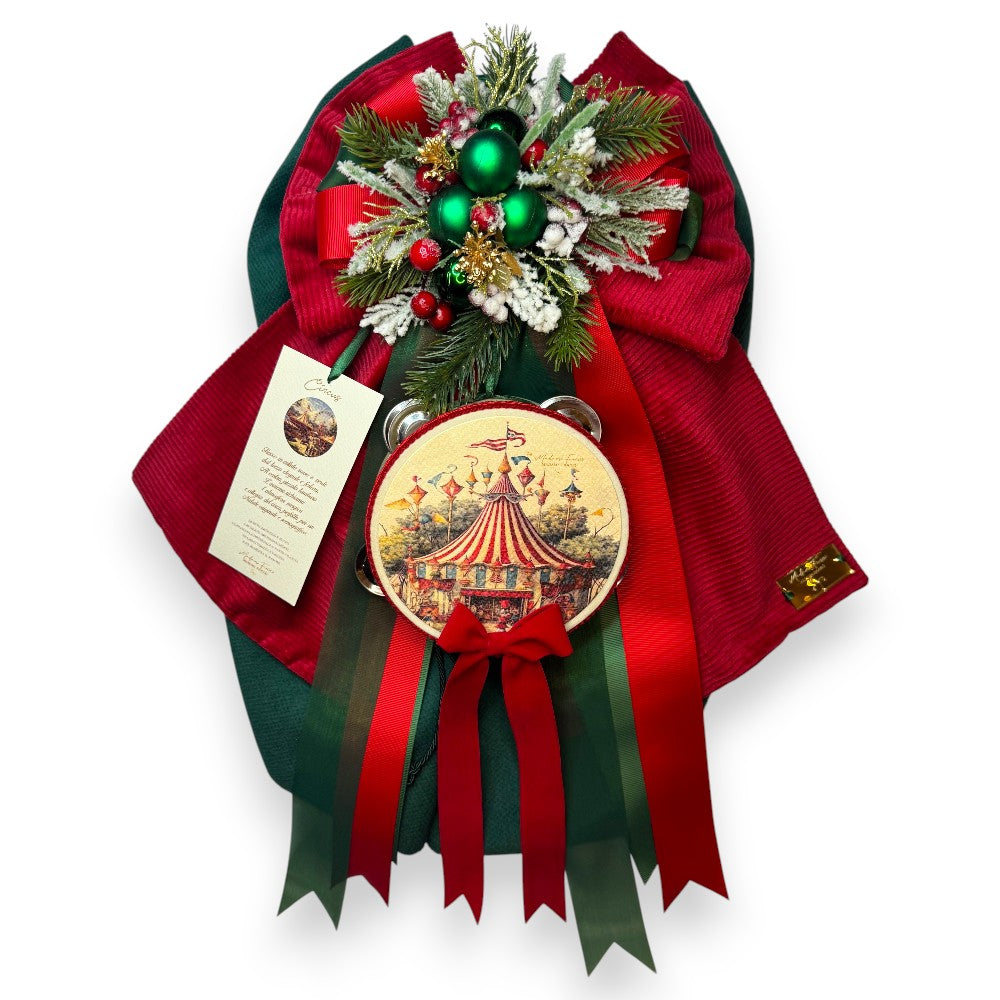 Fiocco decorativo della collezione nataliza di Madame Fioccò, realizzato con un mix di tessuti, tra cui una stoffa a trama spigata e velluto a costine, con tamburello e decorazione centrale.