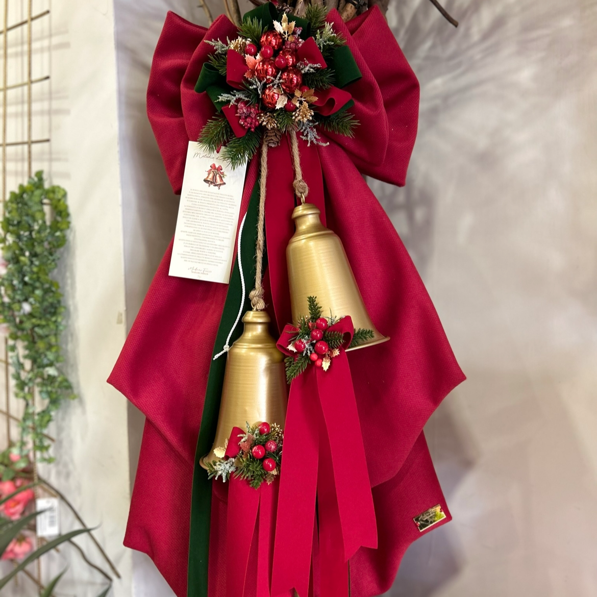 Fiocco decorativo della collezione nataliza di Madame Fioccò, realizzato in tessuto con trama spigata, decorazione centrale e campanelle pendenti.