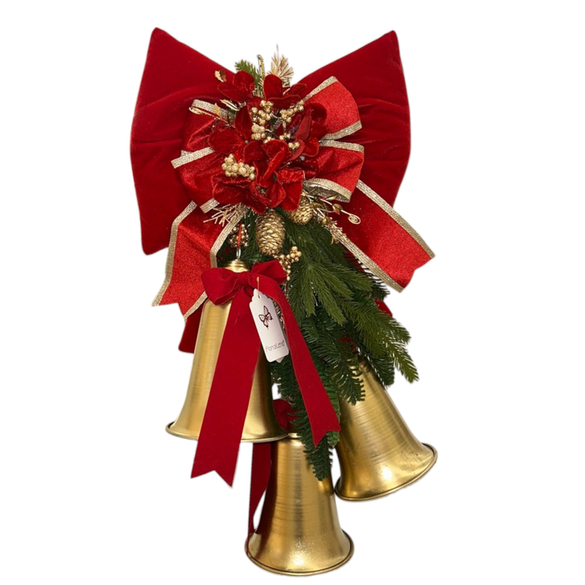 Fiocco della collezione Abbraccio di Natale di Fiori di Lena, realizzato in velluto rosso con nastri, pino e campane dorate.
