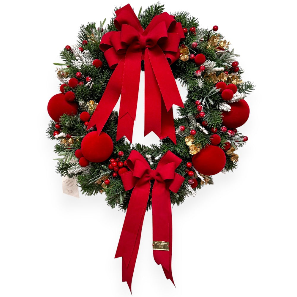 Ghirlanda decorativa della collezione natalizia di Madame Fioccò, realizzata a mano con base di pino, decorato con palline, bacche e fiocchi rossi.