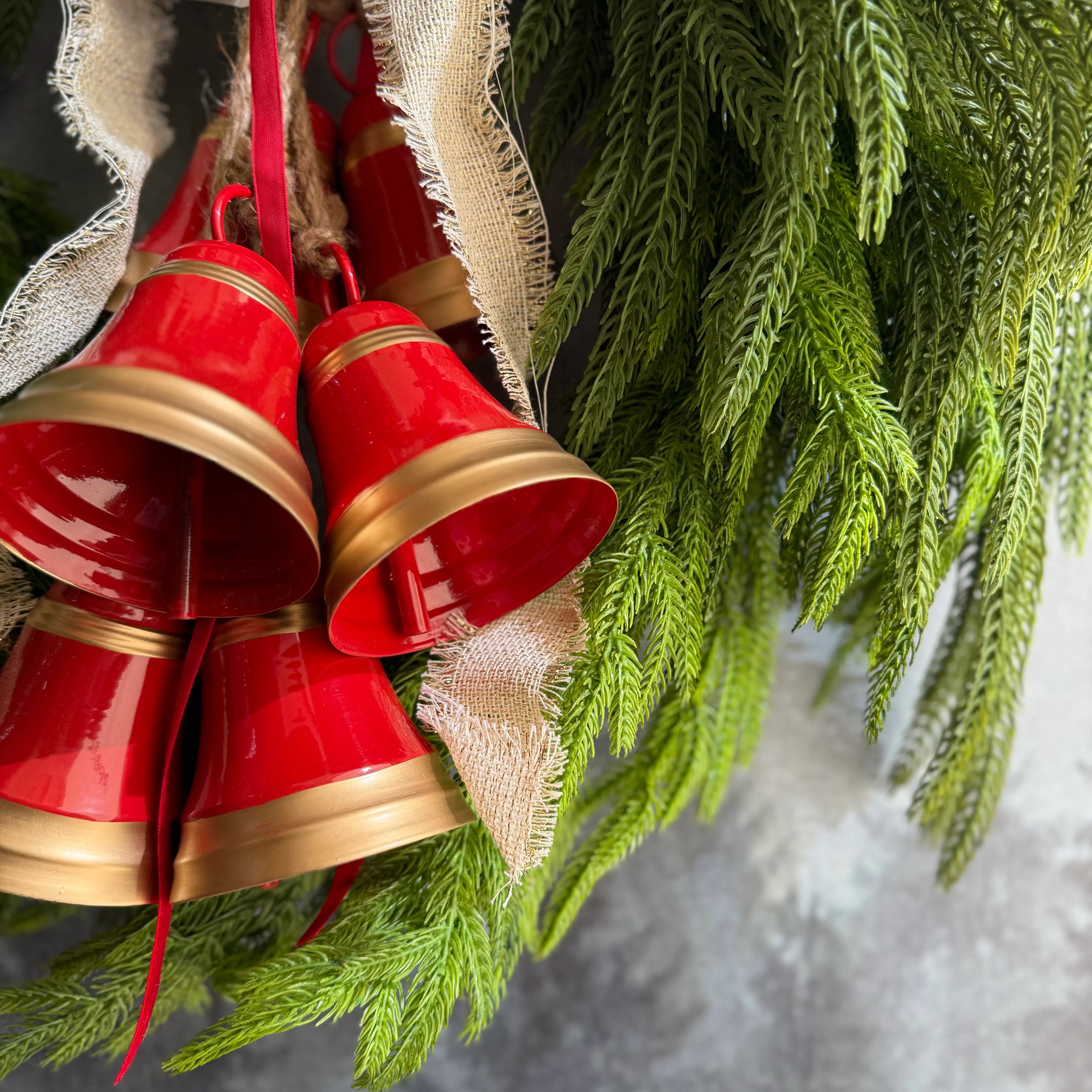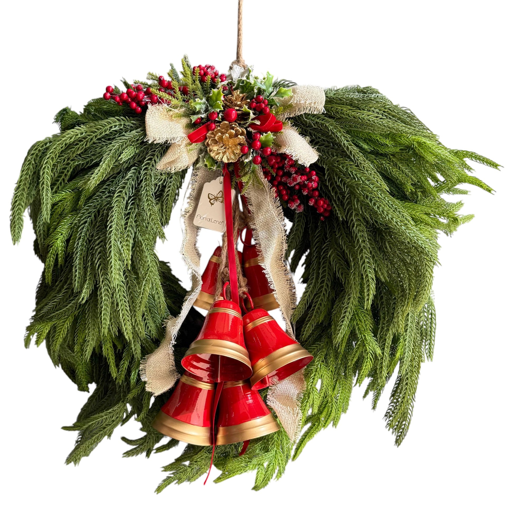 Ghirlanda Natalizia della collezione "Paesaggio Invernale" di Fiori di Lena, realizzata con base in pino, decorata con nastri in tessuto, bacche e campanelle pendenti.