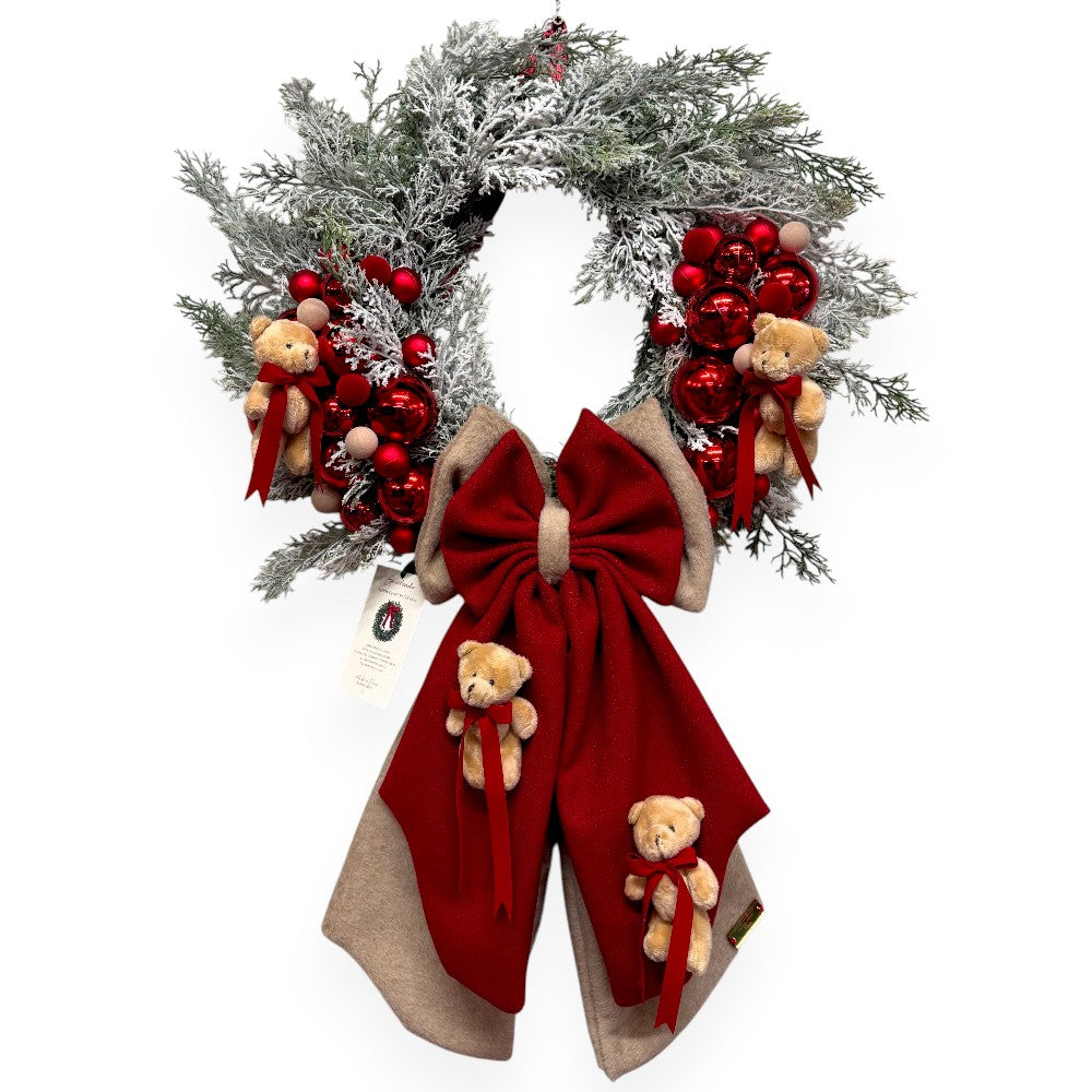 Ghirlanda decorativa della collezione natalizia di Madame Fioccò, realizzata a mano con base di pino innevato, decorato con palline, bacche rosse, fiocchi in tessuto pregiato e piccoli peluche di orsetti.