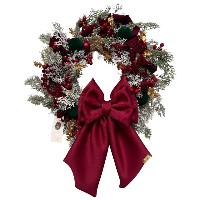 Ghirlanda decorativa della collezione natalizia di Madame Fioccò, realizzata a mano con base di pino, decorato con fiocco pendente, bacche rosse, decorazioni natalizie e sfere in velluto verde bosco.