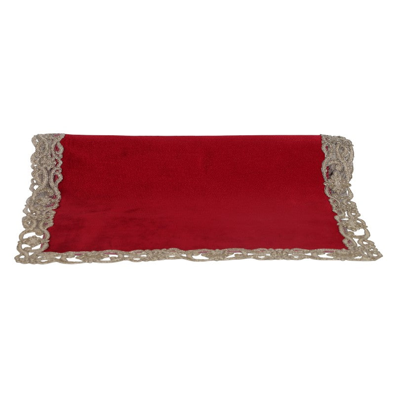 Runner rettangolare della collezione "Luci di Natale" di Fiori di Lena, realizzato in velluto rosso con finiture in pizzo.