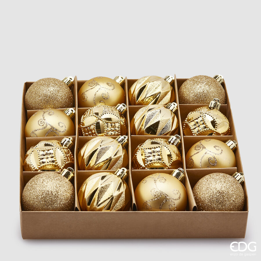 Set di 32 sfere natalizie (2 confezioni da 16 pz.) della collezione di Enzo De Gasperi, realizzate in resina decorata.