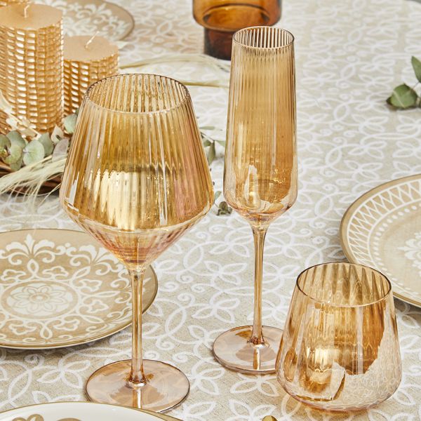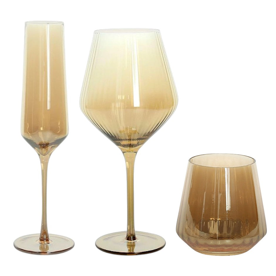 Set da 36 pz. della collezione "Topazio Fumè” di Andrea Fontebasso, realizzato in vetro ambra resistente lavorato.