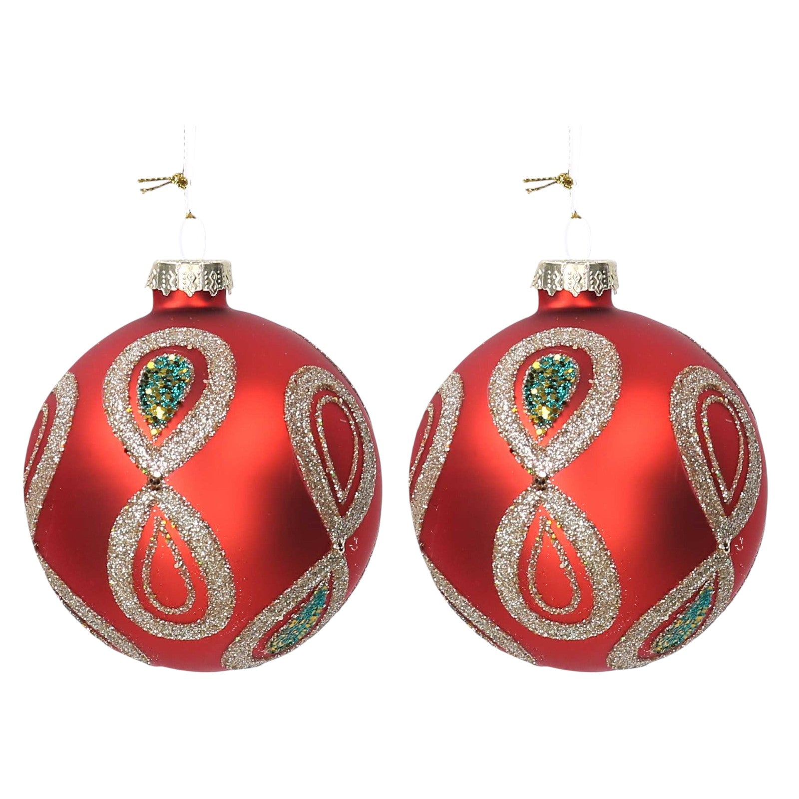 Set 6 Sfere Natalizie della collezione "Christmas" di Prestigio Casa, realizzate in vetro rosso con decori glitter oro e verde.