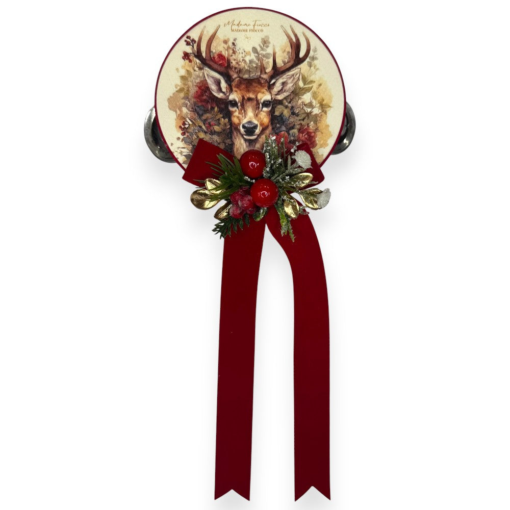 Tamburello Appendino della collezione nataliza di Madame Fioccò, realizzato con base in legno e stampa natalizia sulla superficie, con fiocco in velluto e decori natalizi.