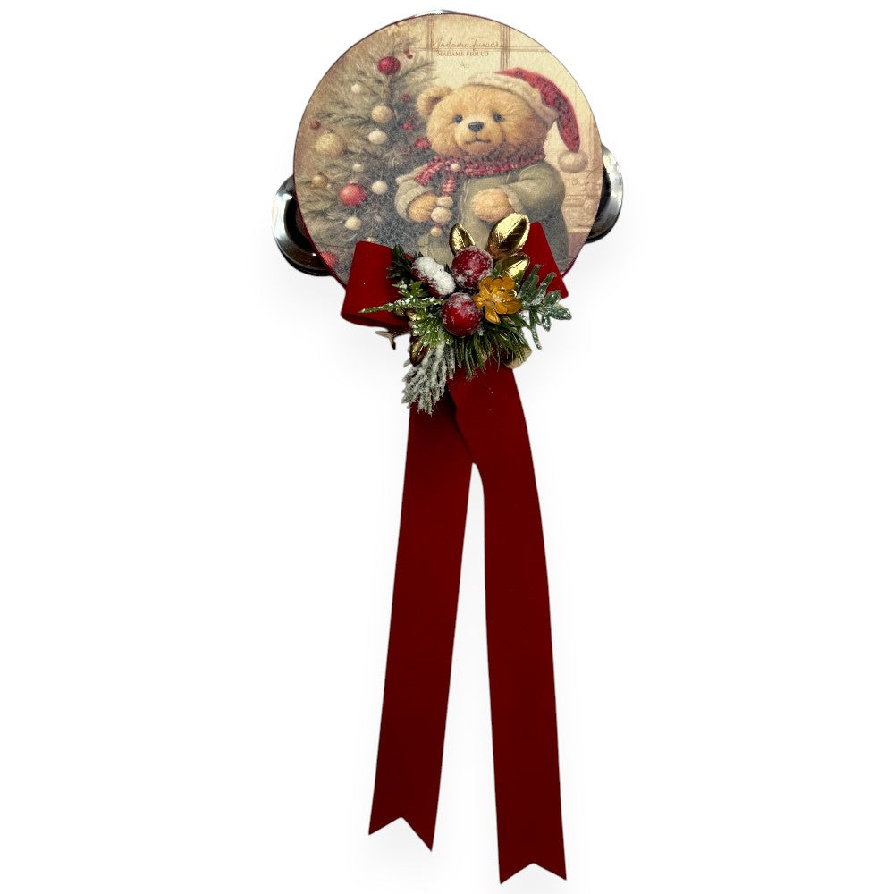 Tamburello Appendino della collezione nataliza di Madame Fioccò, realizzato con base in legno e stampa natalizia sulla superficie, con fiocco in velluto e decori natalizi.
