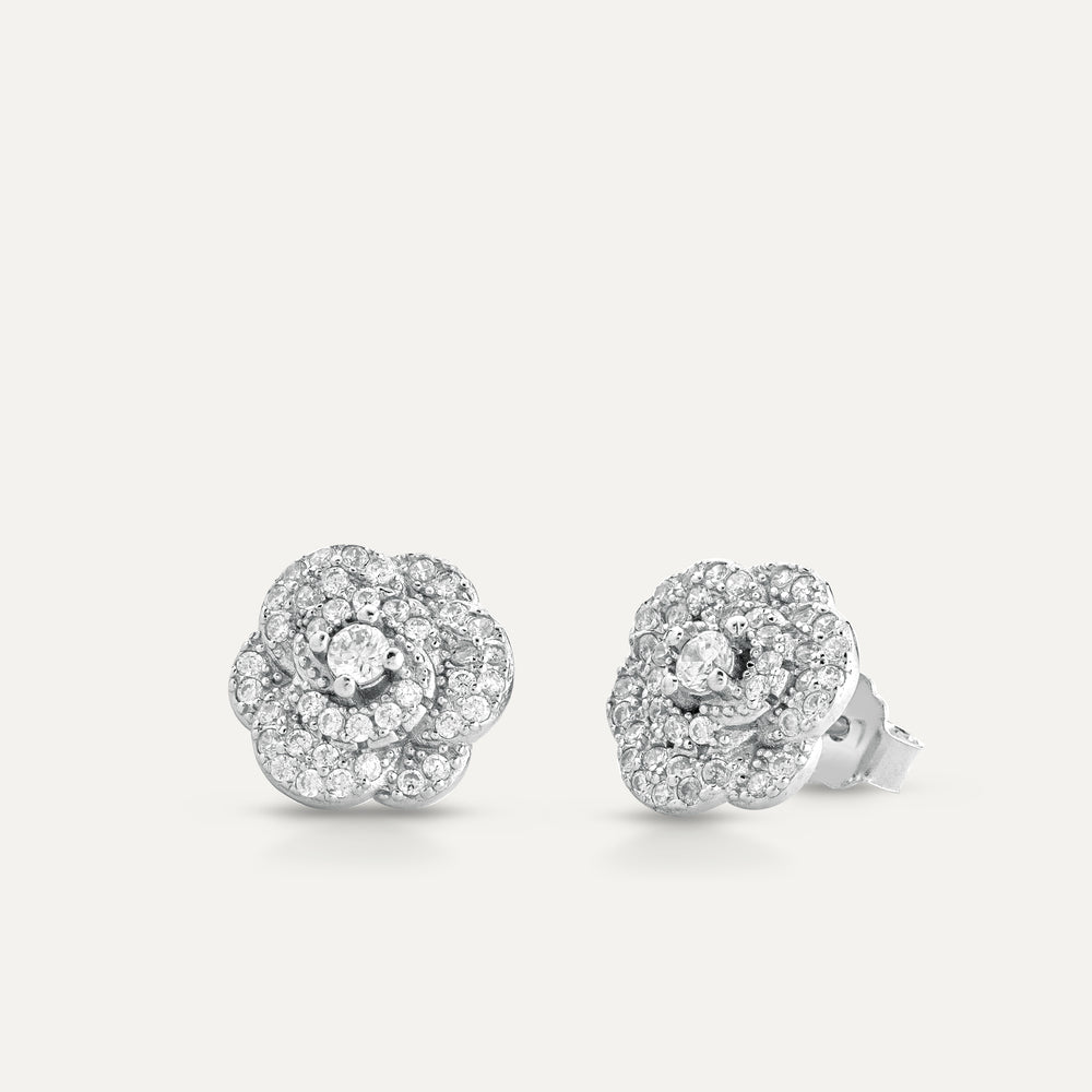 Orecchini Rose Flower realizzati in Argento 925% rodiati in Oro Bianco 18 kt., impreziositi da zirconi bianchi.