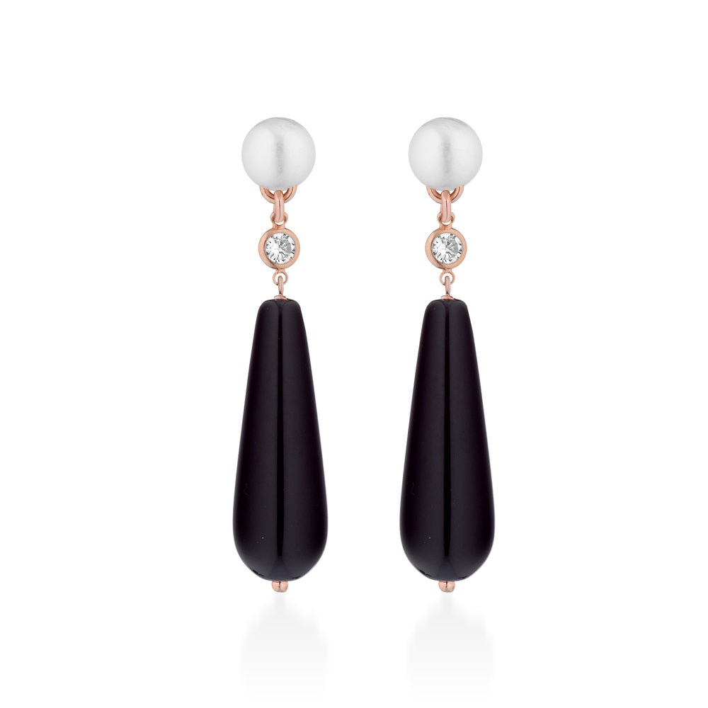Orecchini della collezione "Glamour" di Lelune Gioielli, in argento 925% rosato, impreziositi da perle d’acqua dolce, agata nera e zirconi bianchi.