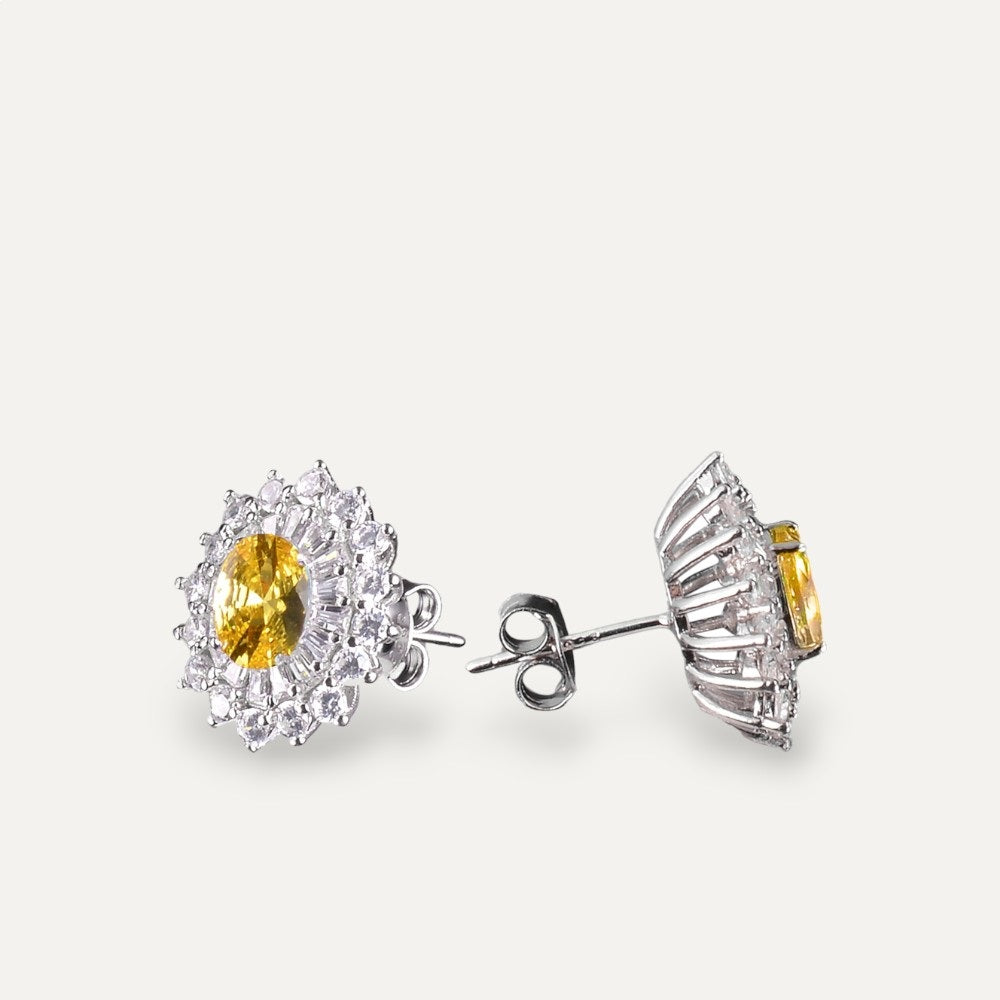 Orecchini Venus realizzati in Argento 925% rodiati in Oro Bianco 18 kt., impreziositi da zirconi citrino contornati da cristalli bianchi.