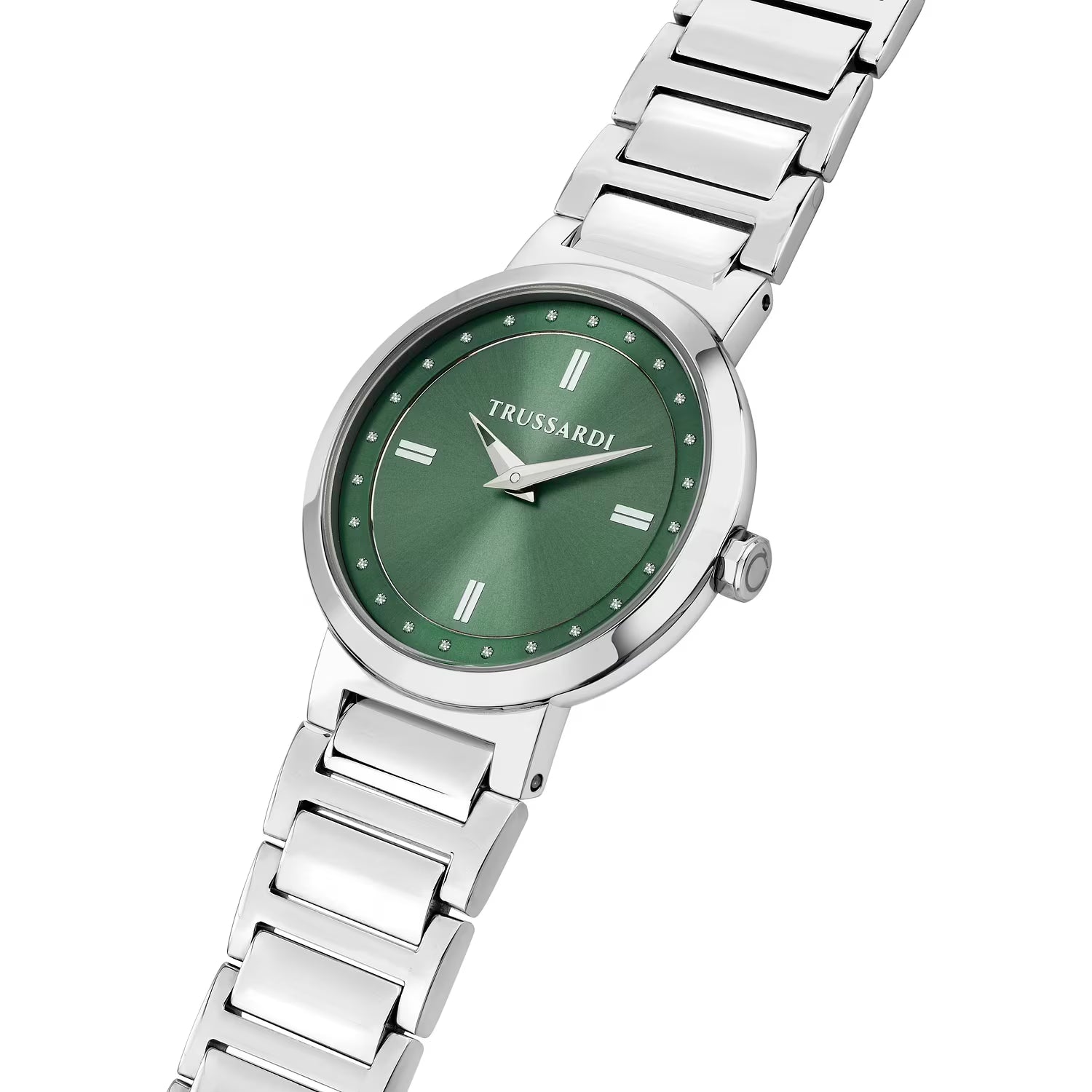 Il quadrante è di colore verde con logo nella parte alta e zirconi bianchi agli indici.
